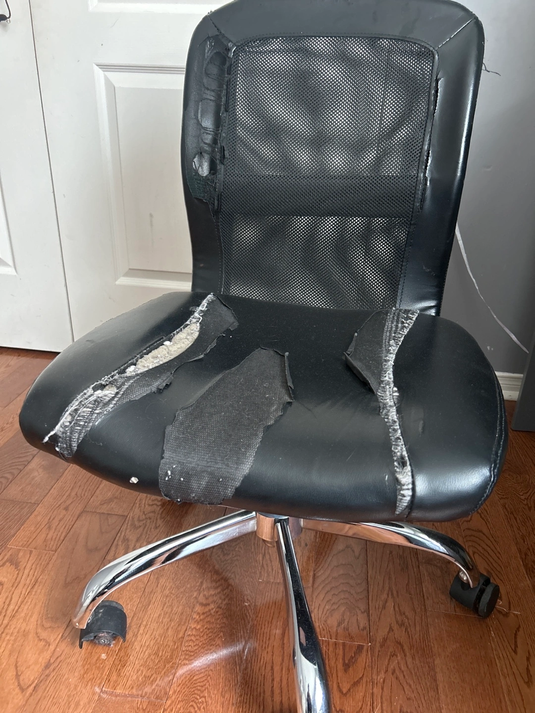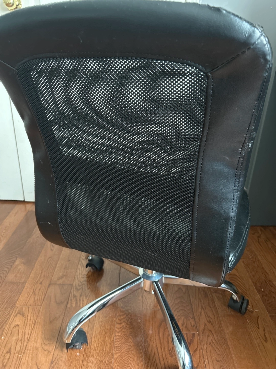 This office chair has seen better days, as you can see from the photos. It's definitely well-used, but the base and wheels are still in good working order. Could be good for someone who needs a temporary chair or is looking for parts