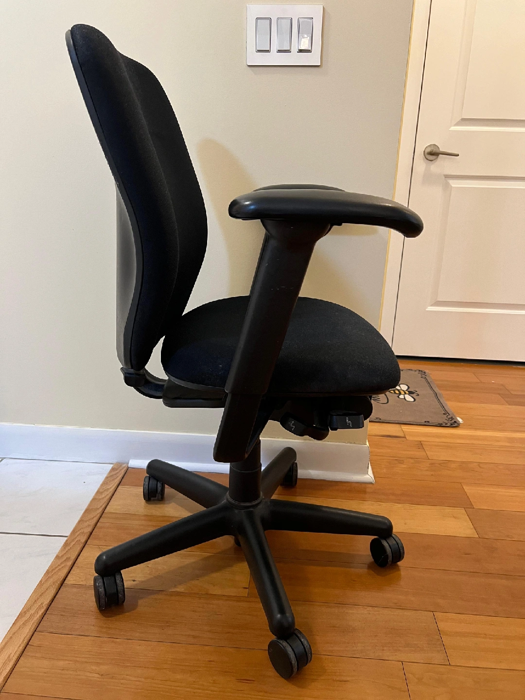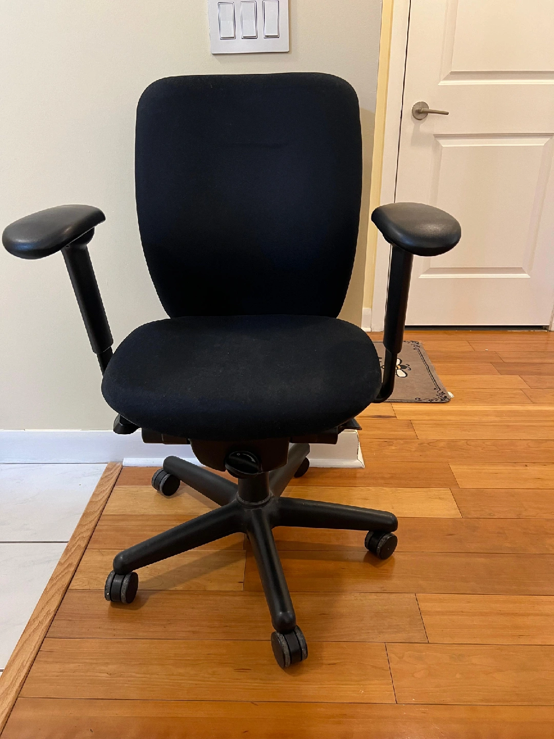 194Selling a black office chair in good condition. It's perfect for a home office or study space! The chair features adjustable height and armrests for personalized comfort. It has a sturdy base with smooth-rolling casters for easy movement around your workspace