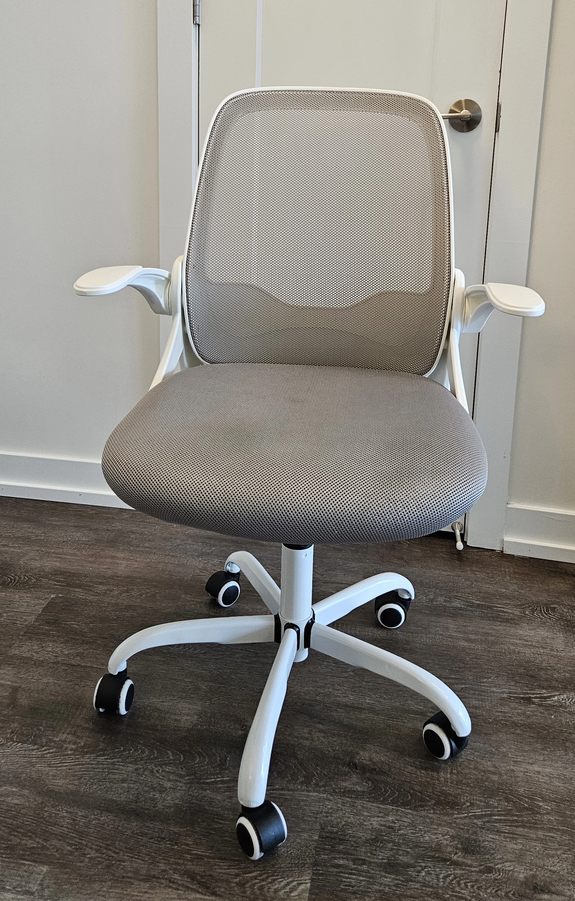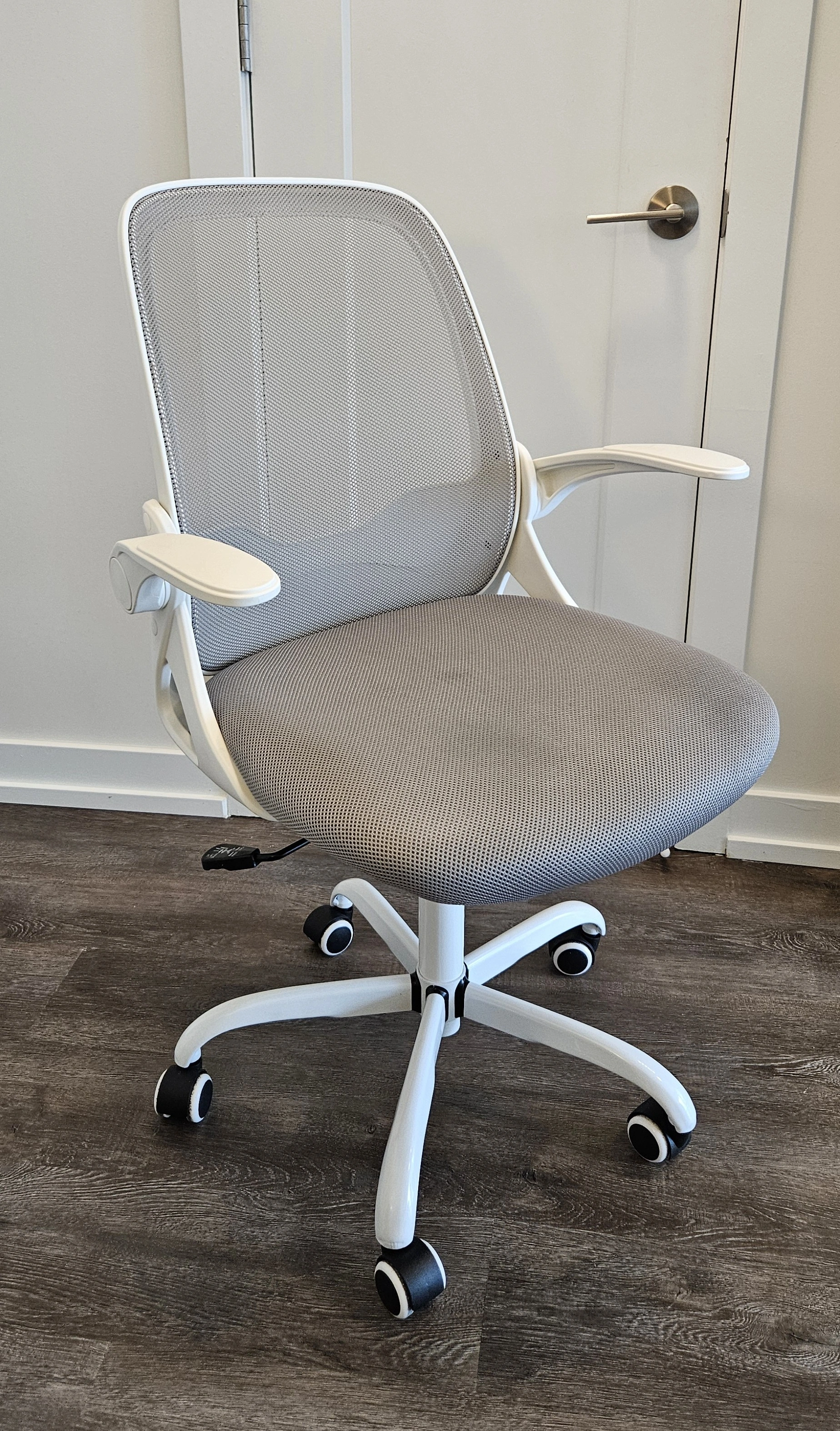 128Comfortable office chair in excellent used condition. Features a breathable mesh back, padded seat, and smooth-rolling wheels. Flip-up armrests allow for easy storage under desks or flexible use.
