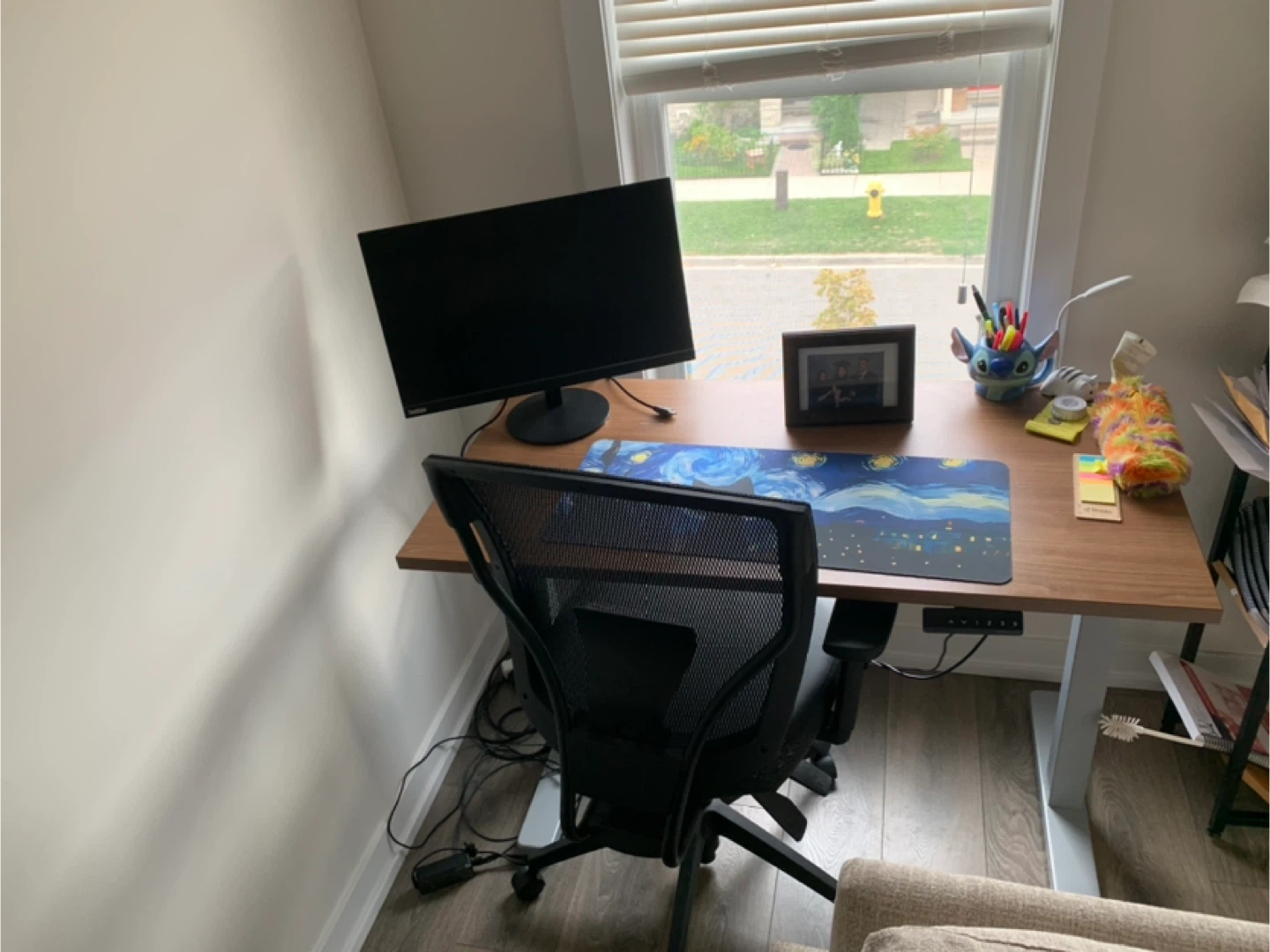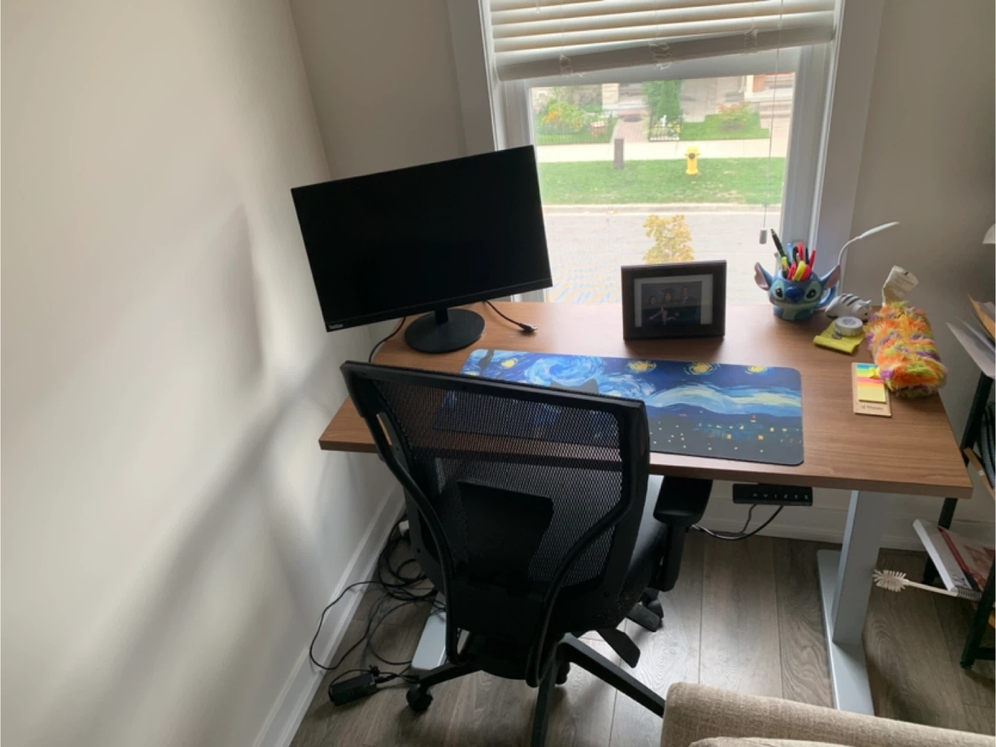 Office Desk and Blue Mesh Chair