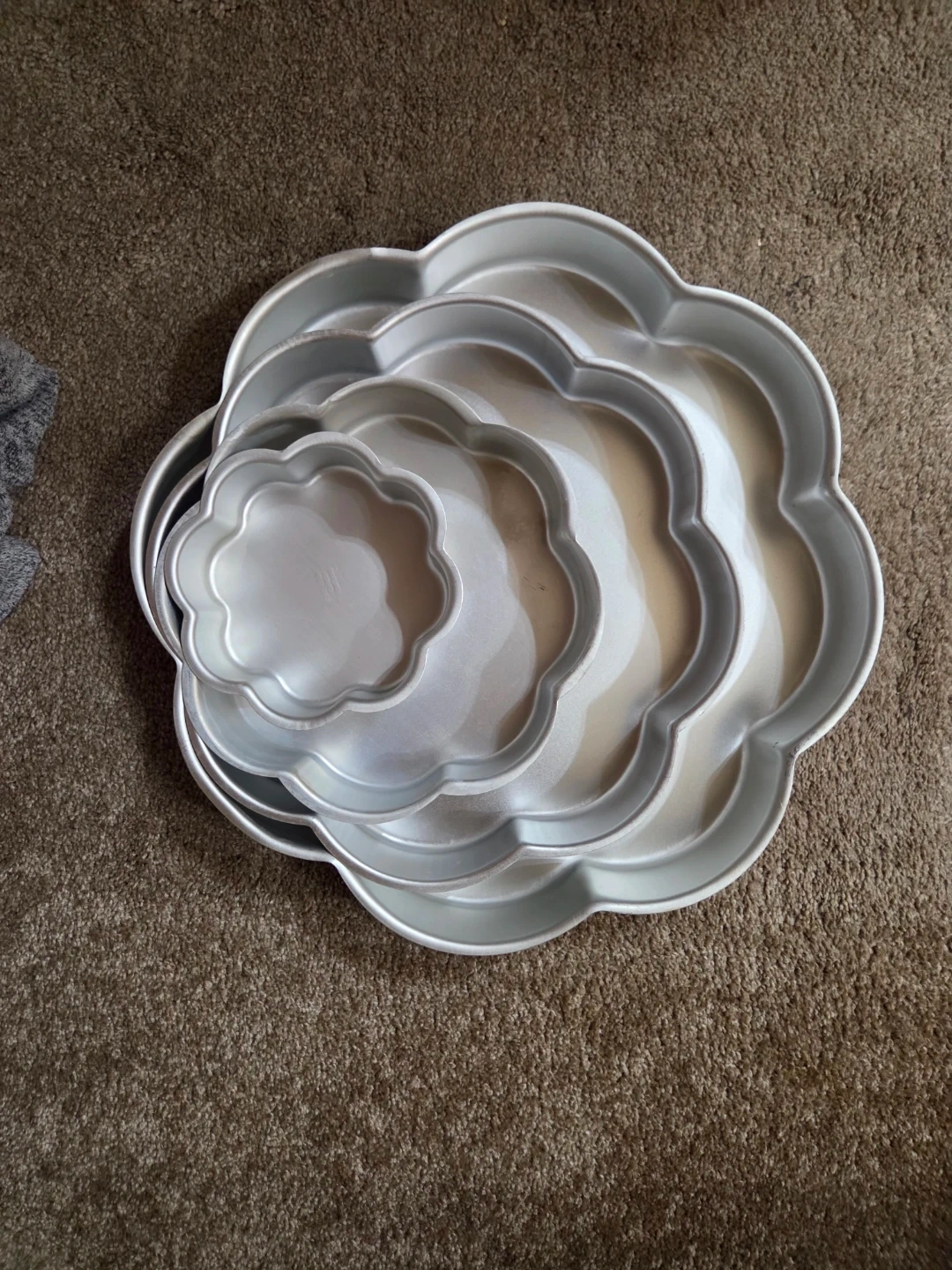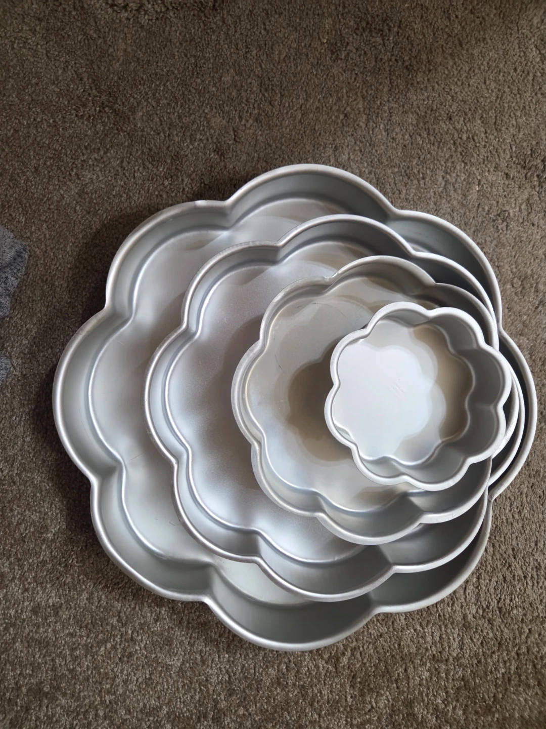 This is a set of four flower-shaped cake pans. They're made of aluminum. This set is wonderful for creating tiered cakes or individual floral desserts!