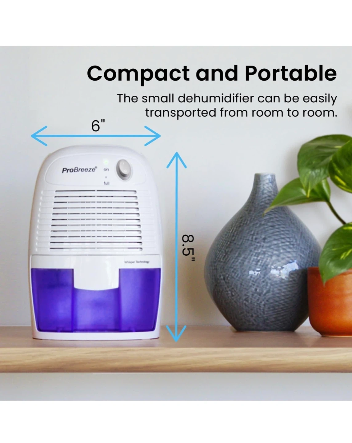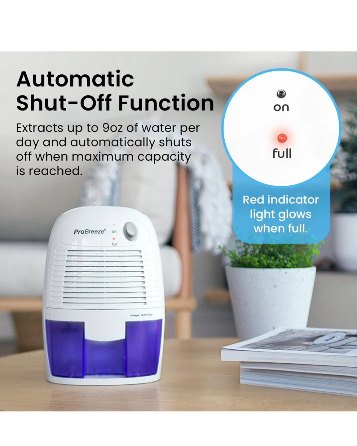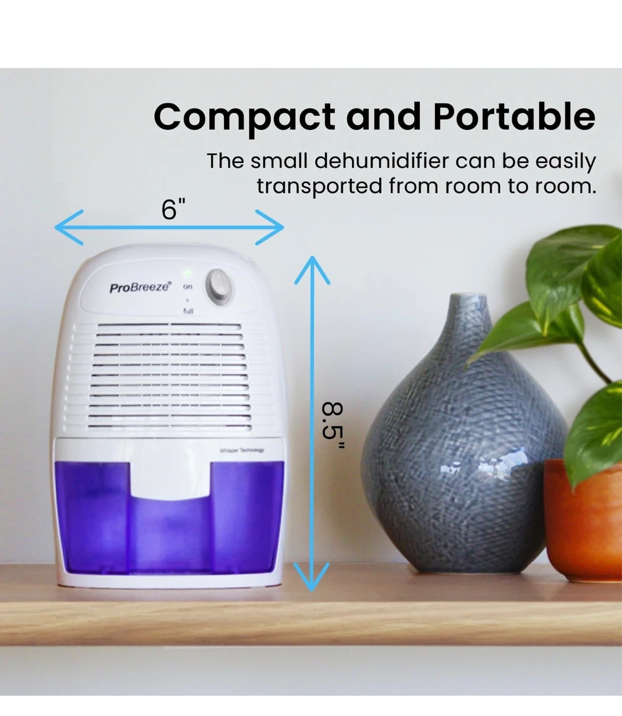 This ProBreeze dehumidifier extracts up to 9oz of water per day. It features an automatic shut-off function when the 17oz water tank is full. The unit is compact and portable, measuring 6" wide by 8.5" high. Whisper Technology is used.
