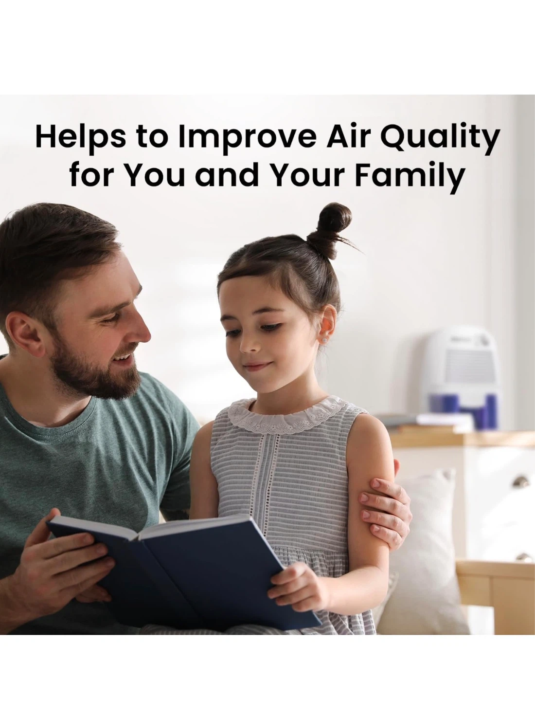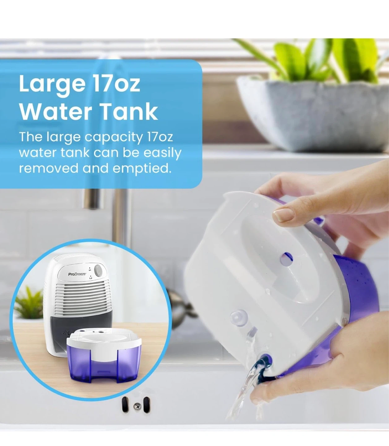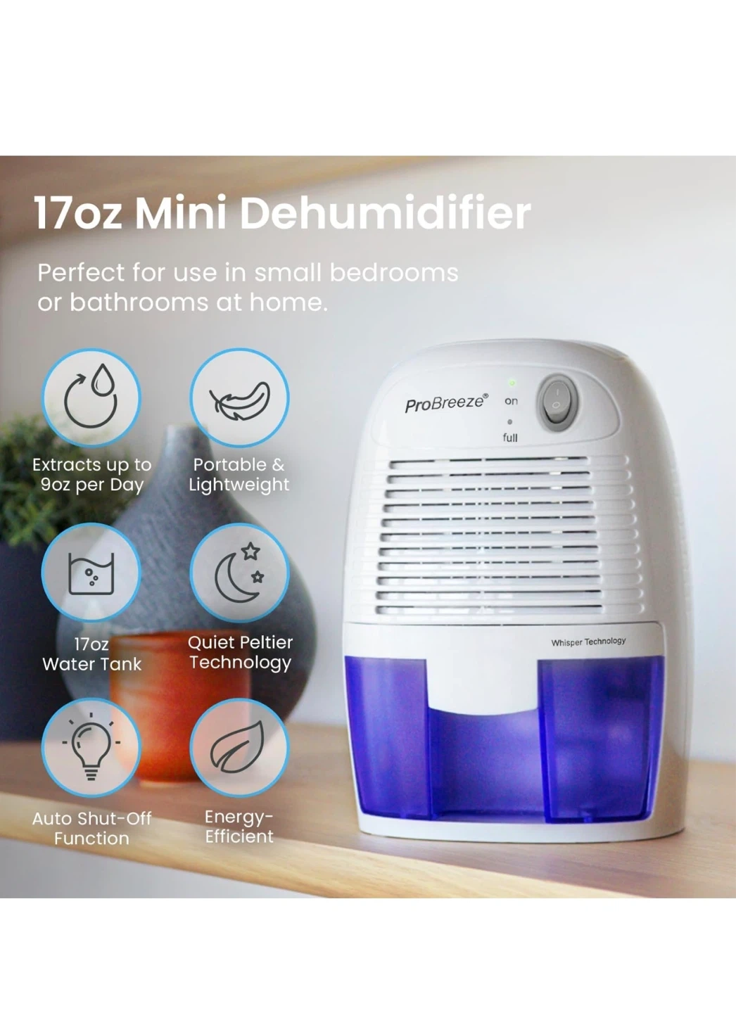 This ProBreeze dehumidifier extracts up to 9oz of water per day. It features an automatic shut-off function when the 17oz water tank is full. The unit is compact and portable, measuring 6" wide by 8.5" high. Whisper Technology is used.