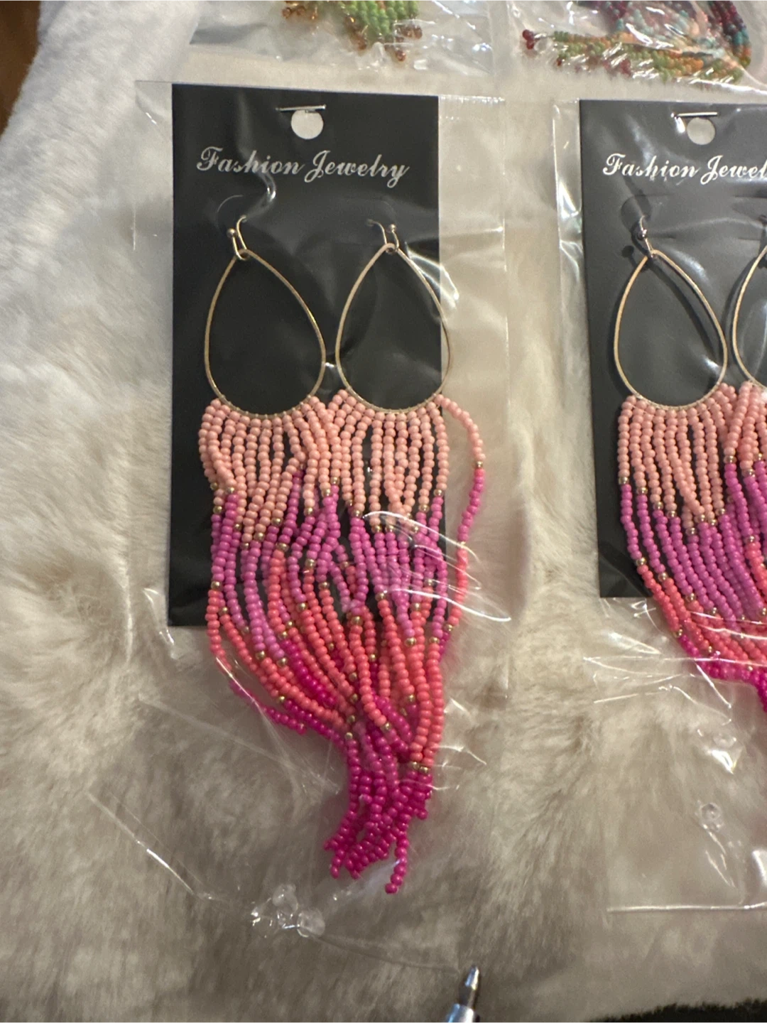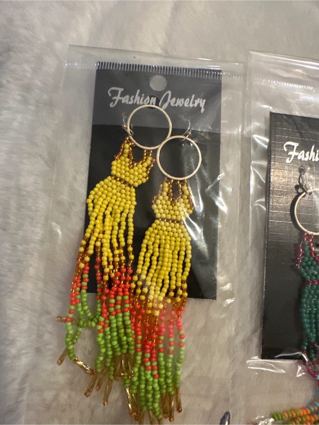 These fashion earrings feature a beaded fringe design with gold-tone hoops. They come in a variety of colors and styles. Adds a pop of color to any outfit!