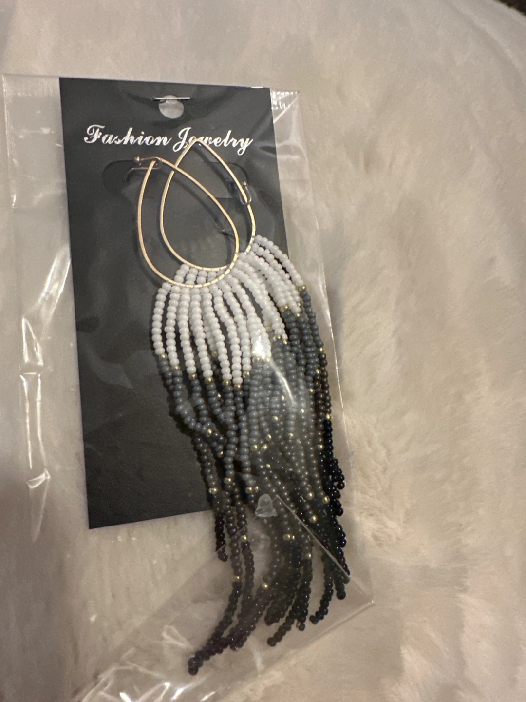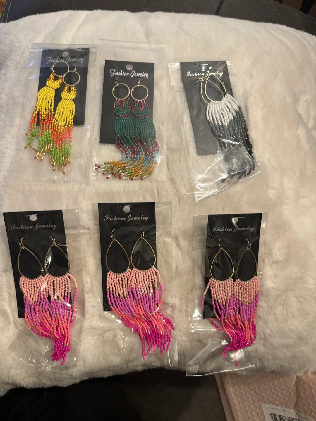These fashion earrings feature a beaded fringe design with gold-tone hoops. They come in a variety of colors and styles. Adds a pop of color to any outfit!