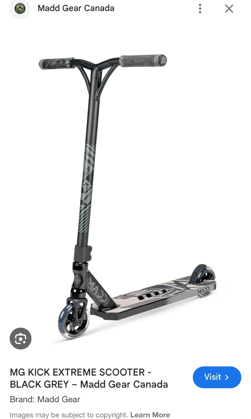 This is a Madd Gear MG Kick Extreme Scooter in black, grey, and green. It’s tucked away in my storage unit at the moment but it’s used but still great for It features as a sturdy deck and comfortable grip handles for a smooth ride. Perfect for recreational use and learning new tricks as a kid