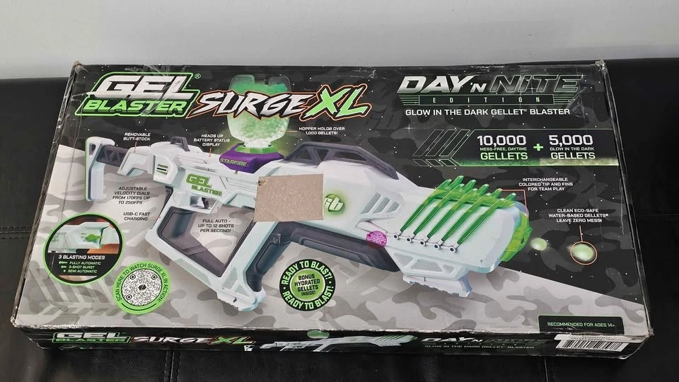 Awesome Gel Blaster Surge XL. Shoots gellets and has adjustable blaster modes: single blast, full auto, low velocity (170 FPS), and high velocity (250 FPS). Has a 150-foot range. Gellets are non-toxic, fully hydrate in 4 hours, and disintegrate on impact. Super fun and mess-free.