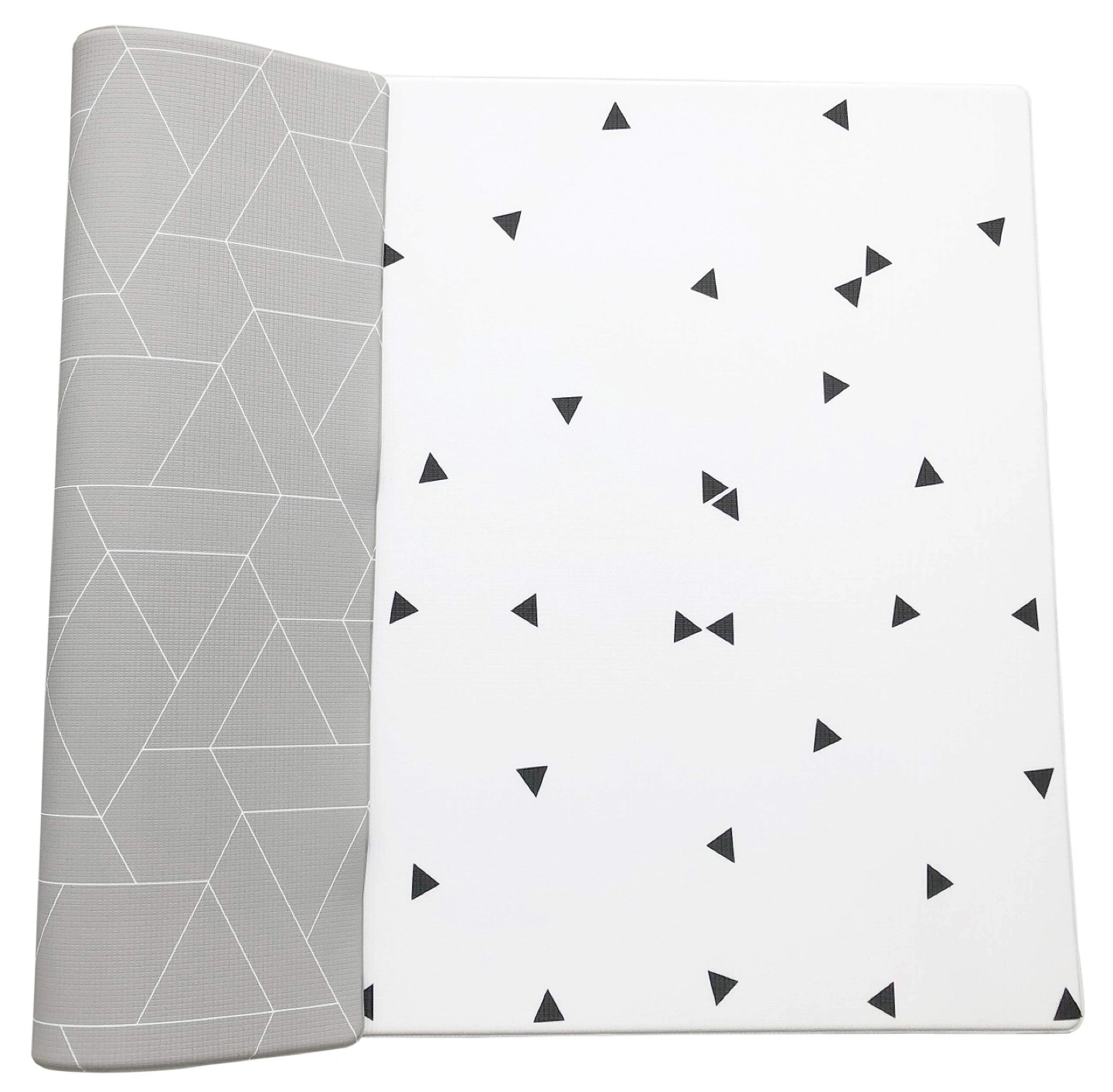 52Double-sided playmat. One side features a grey geometric pattern, the other a white background with black triangles. Soft and comfortable for babies. Perfect for playtime. The white is discolored. The gray is in perfect condition.