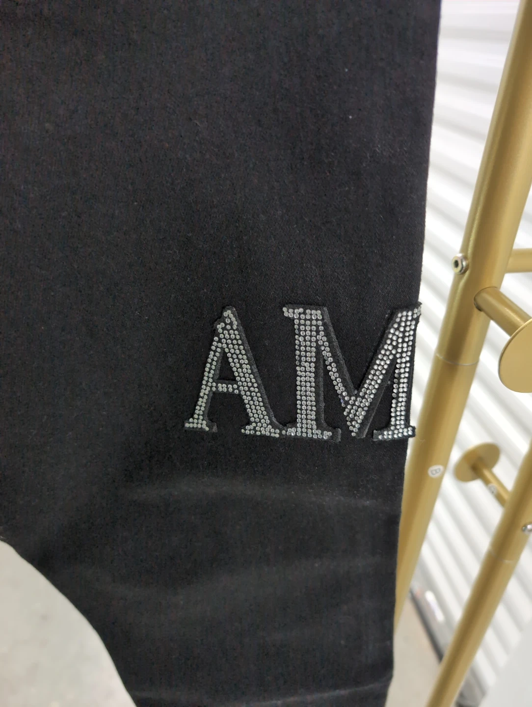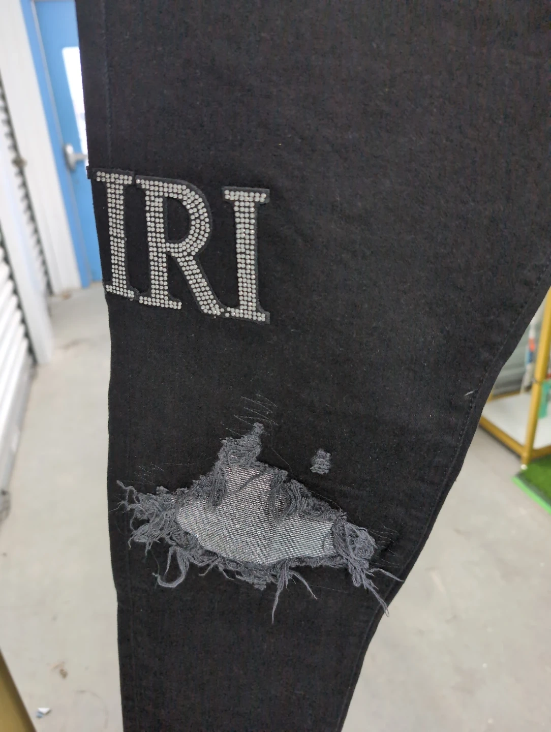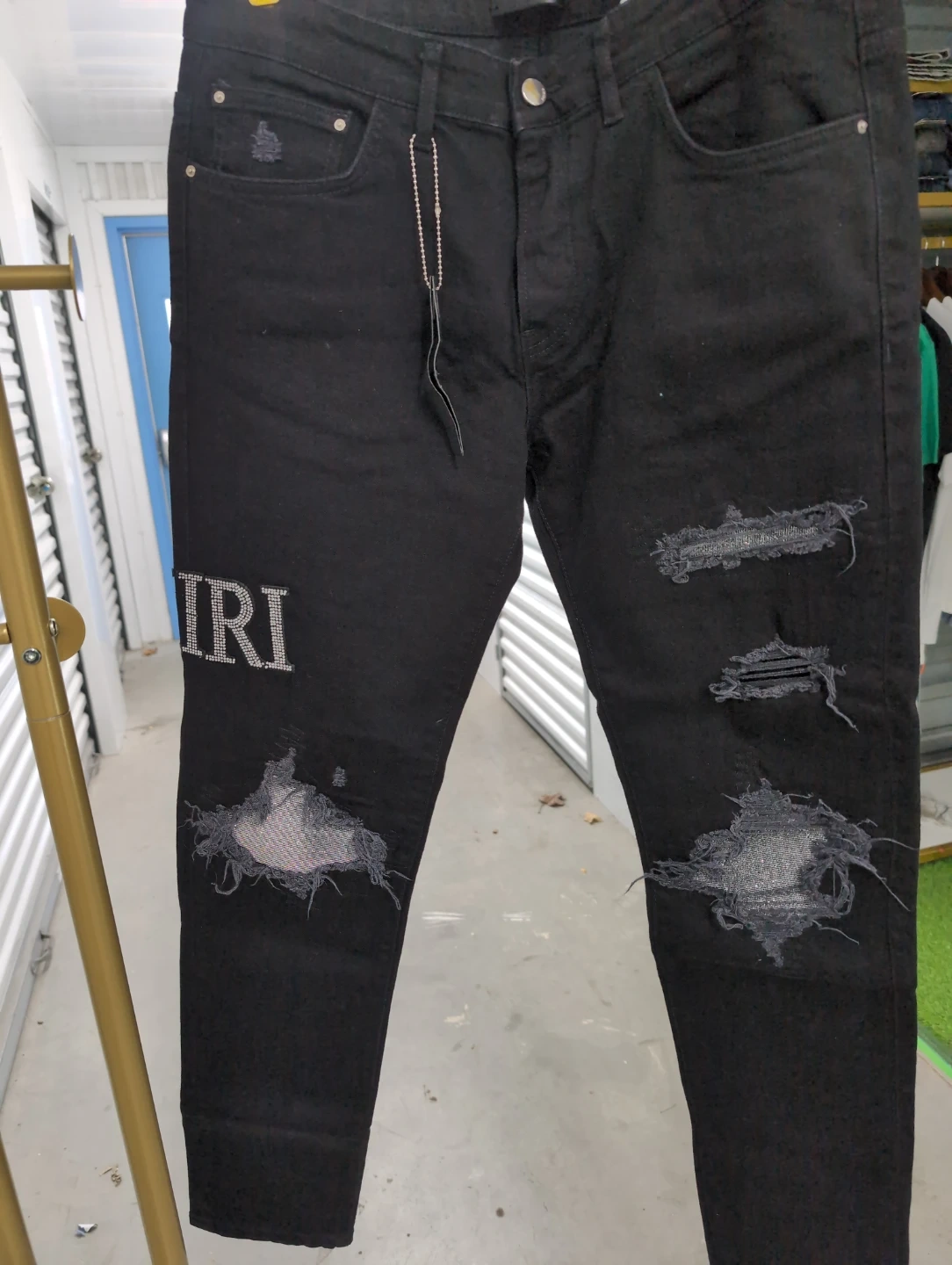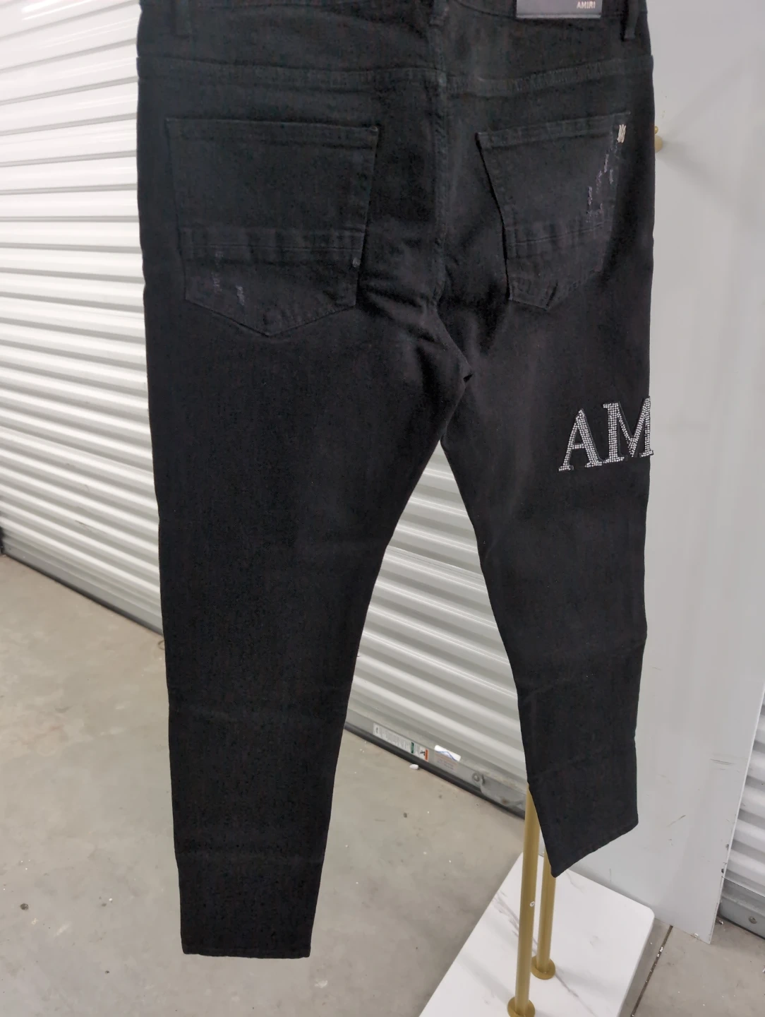 Selling a pair of Amiri jeans in black. These jeans feature a distressed design and the Amiri logo on the back pocket and leg. They are in good condition and ready for a new home!