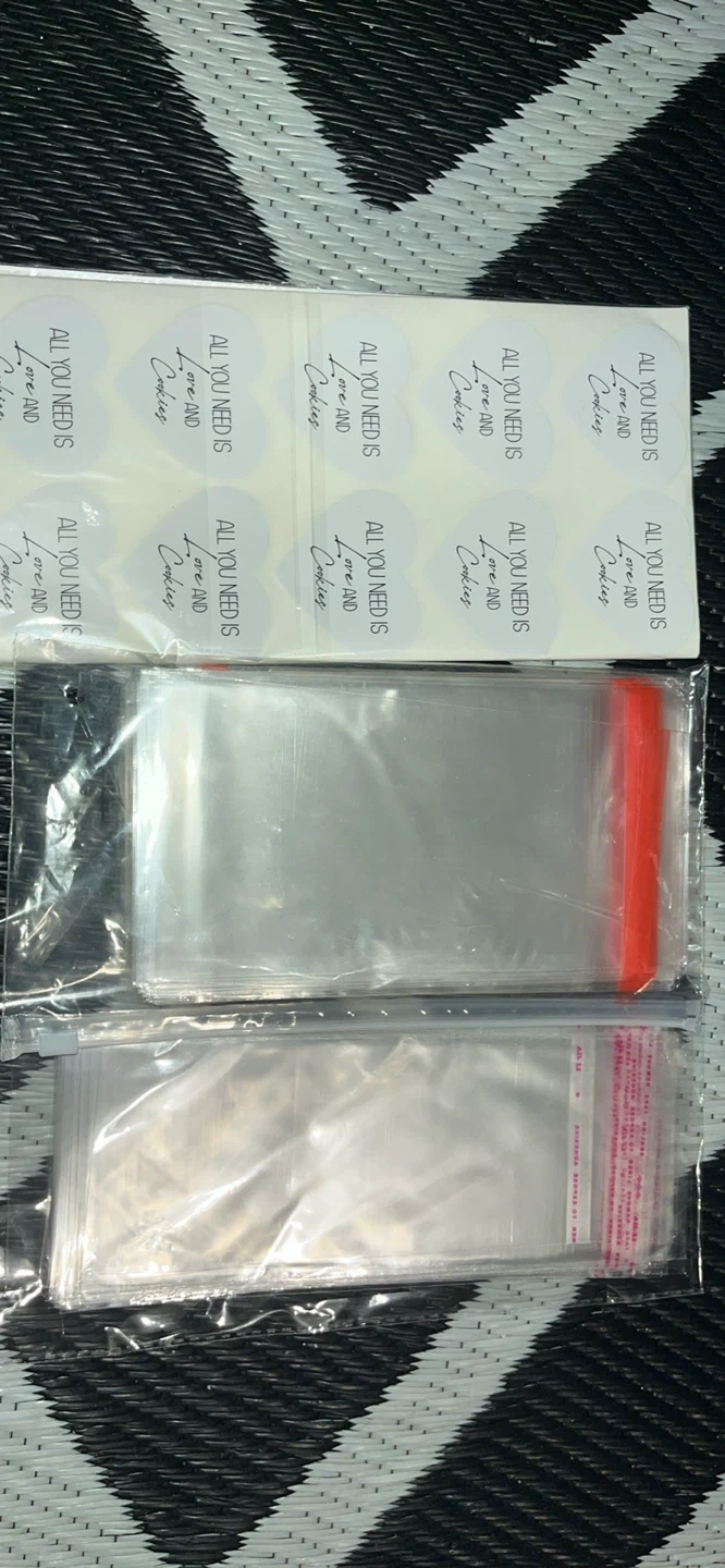 Includes a couple sheet of heart-shaped stickers that say 'ALL YOU NEED IS Love and Cookies'. Also comes with clear treat bags for baking or packaging goodies. Perfect for homemade treats!