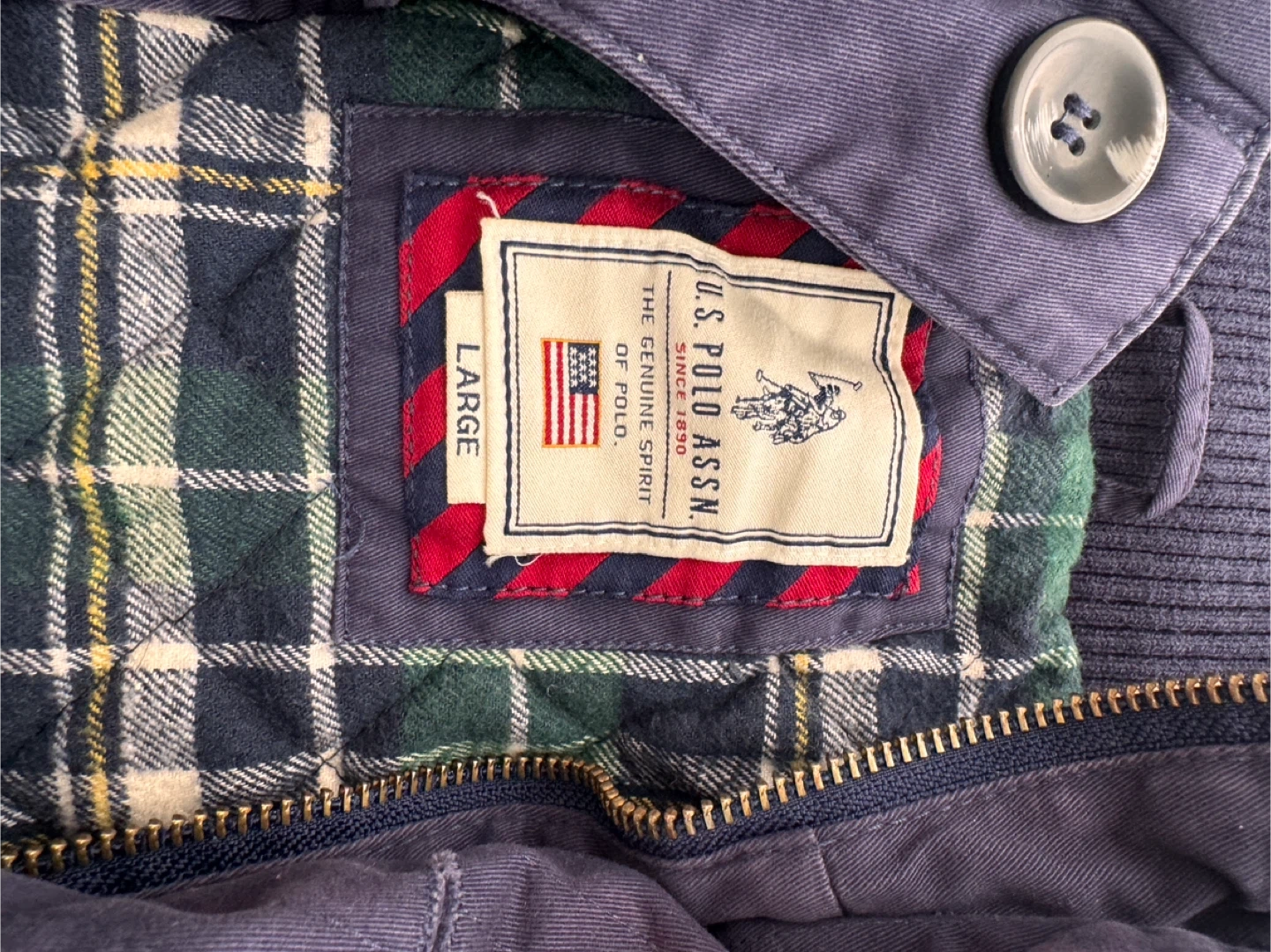 A smart U.S. Polo Assn. Navy Jacket in a large size. It is stylish with zip as well as button closing. It also has waist tighting feature which gives a sleek and smooth finish.