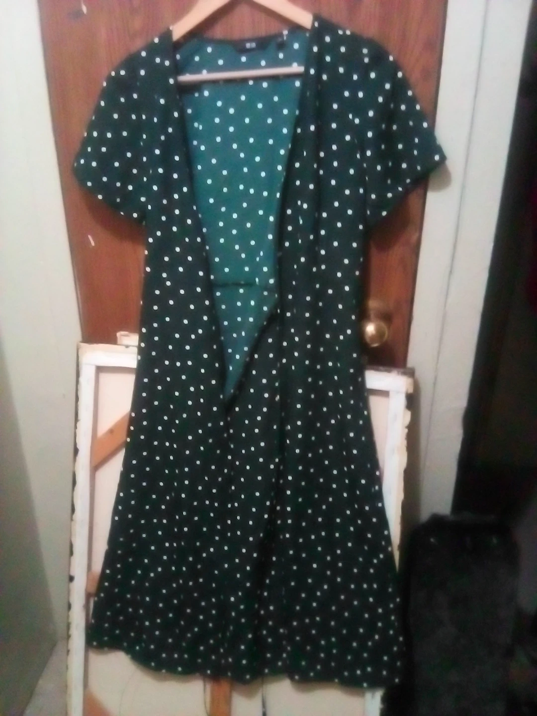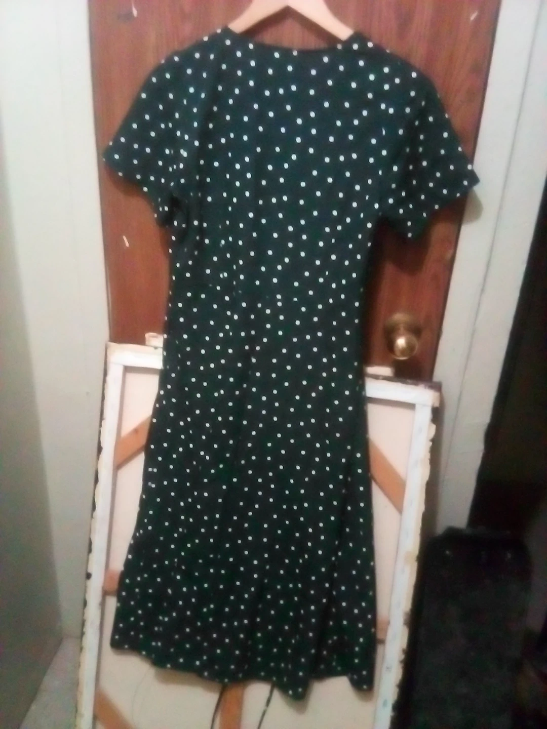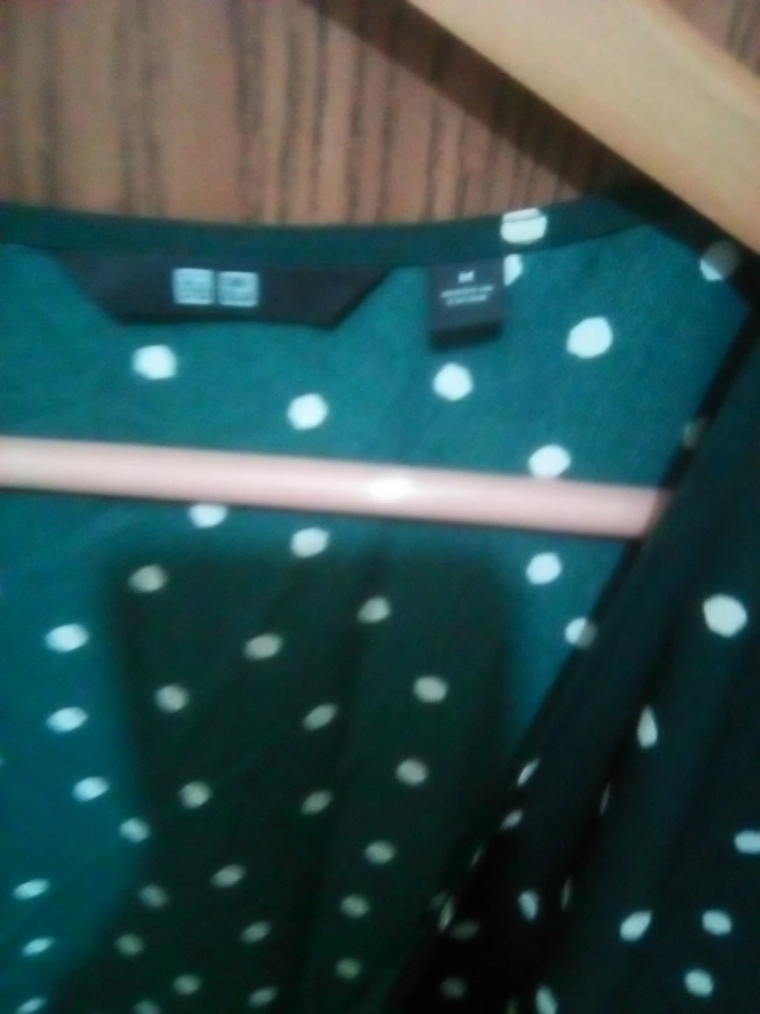 This is a Uniqlo dress in a dark green with a white polka dot pattern. It's a size medium. The fabric is lightweight and flows nicely. Perfect for casual wear or dressing up!