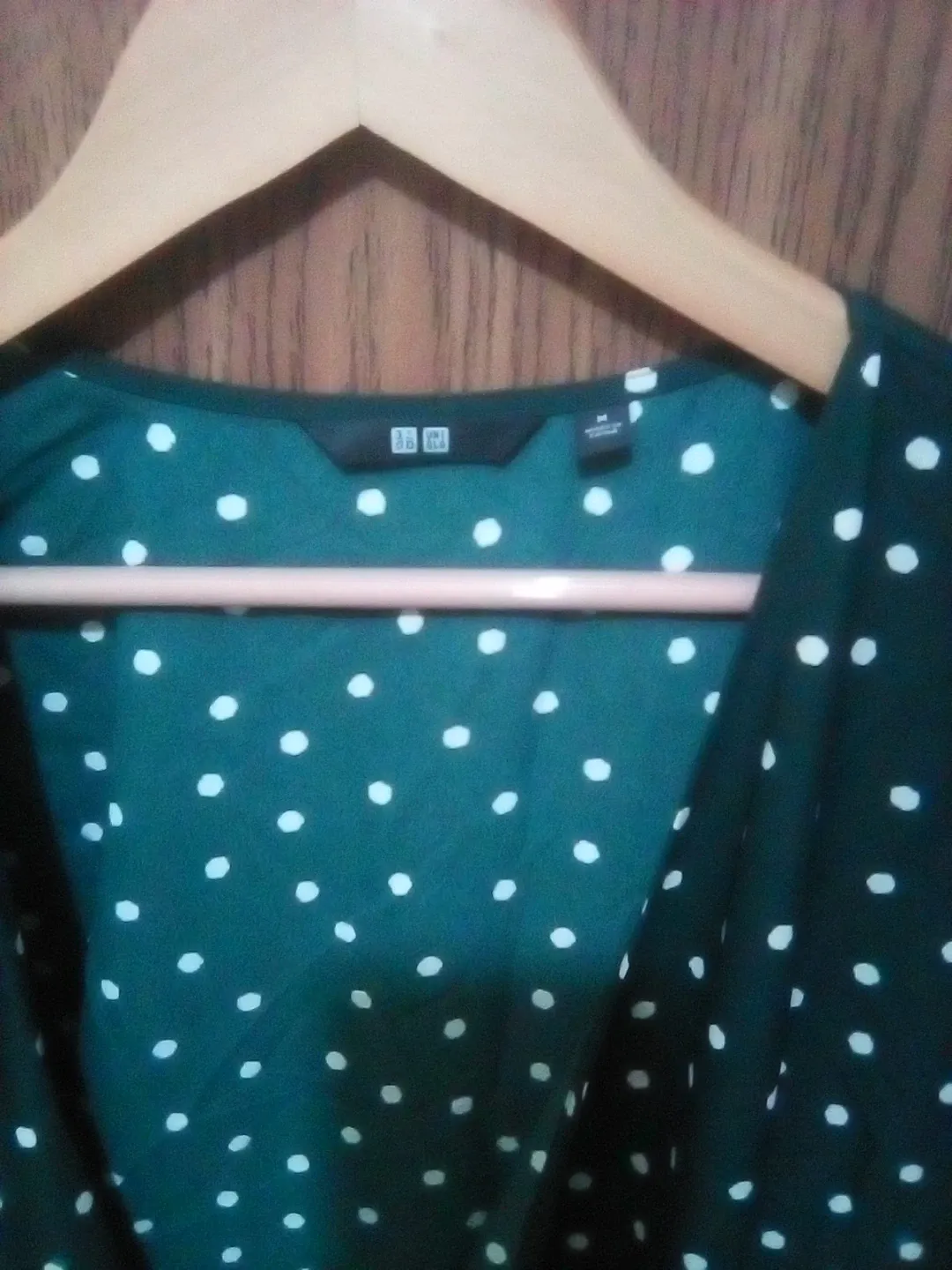 This is a Uniqlo dress in a dark green with a white polka dot pattern. It's a size medium. The fabric is lightweight and flows nicely. Perfect for casual wear or dressing up!