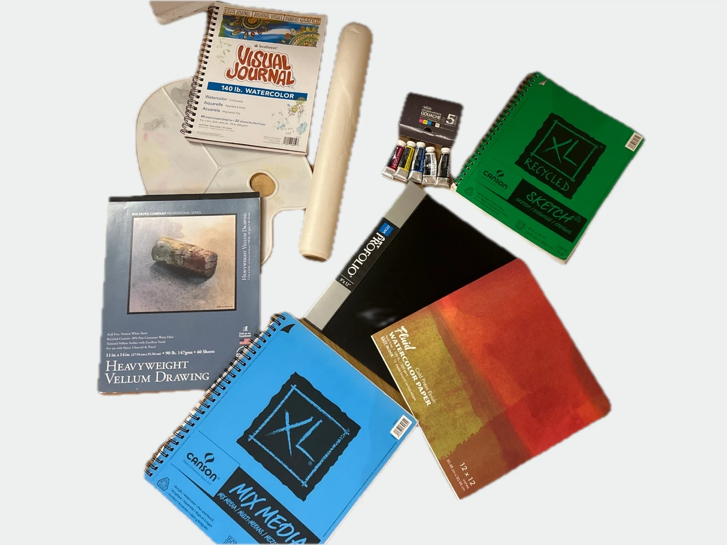 - color palette,sketchbooks,tracing paper, gouache painting, portfolio case