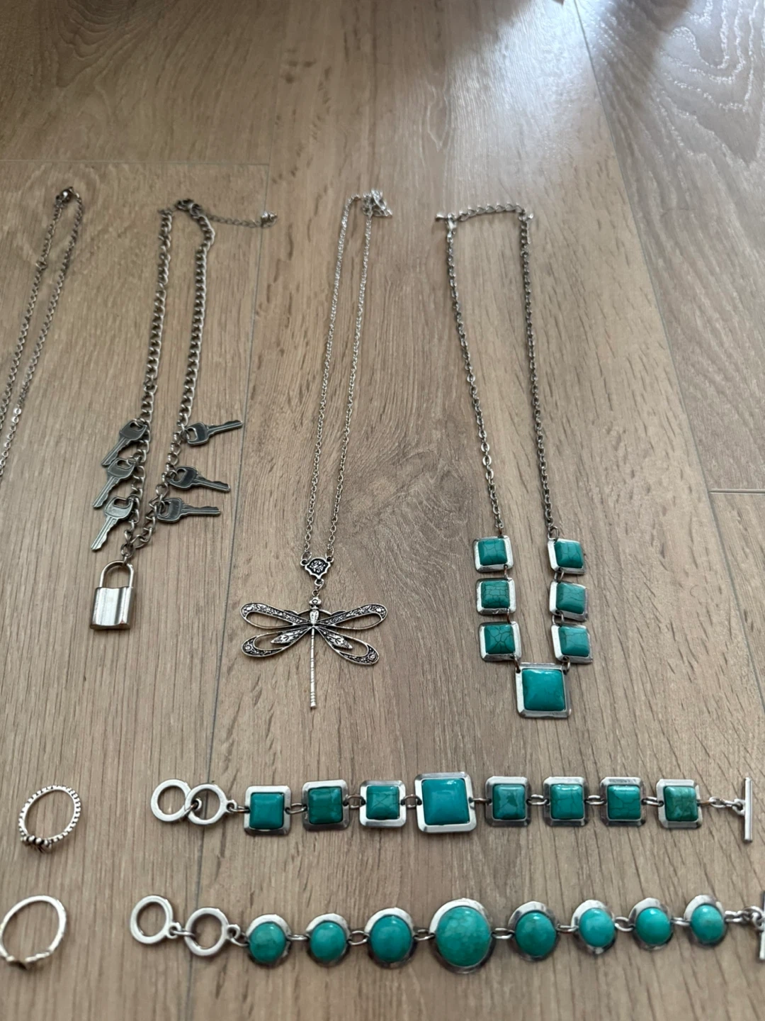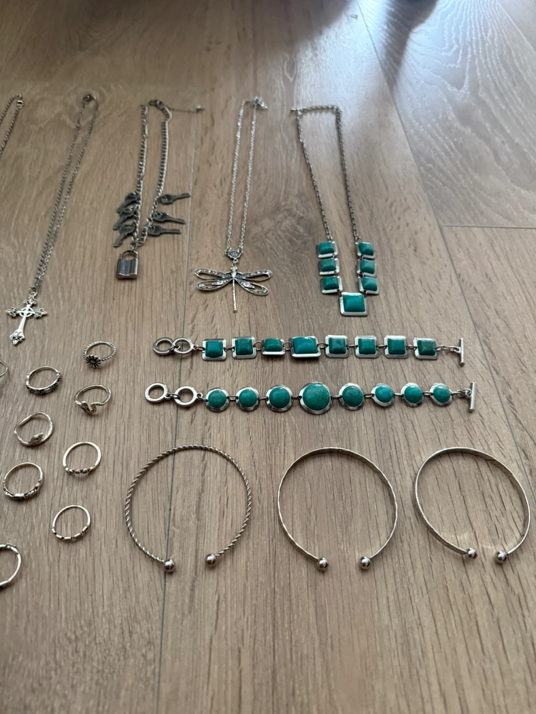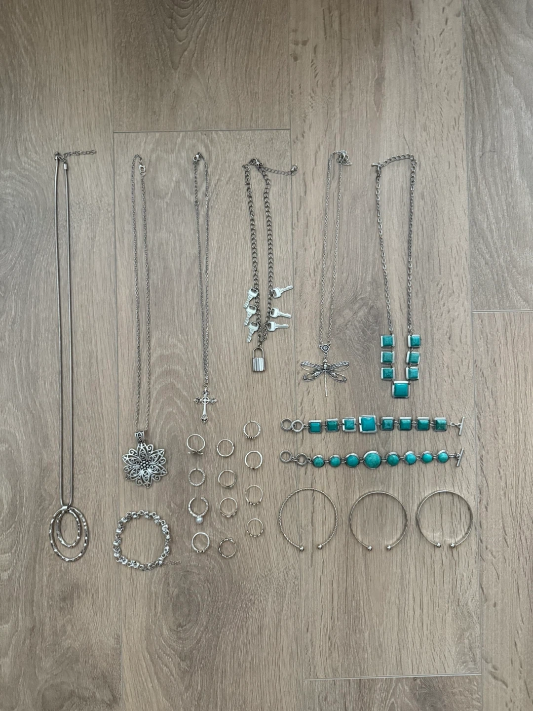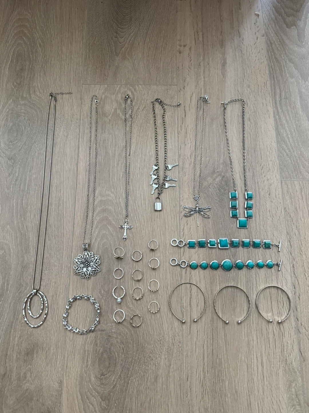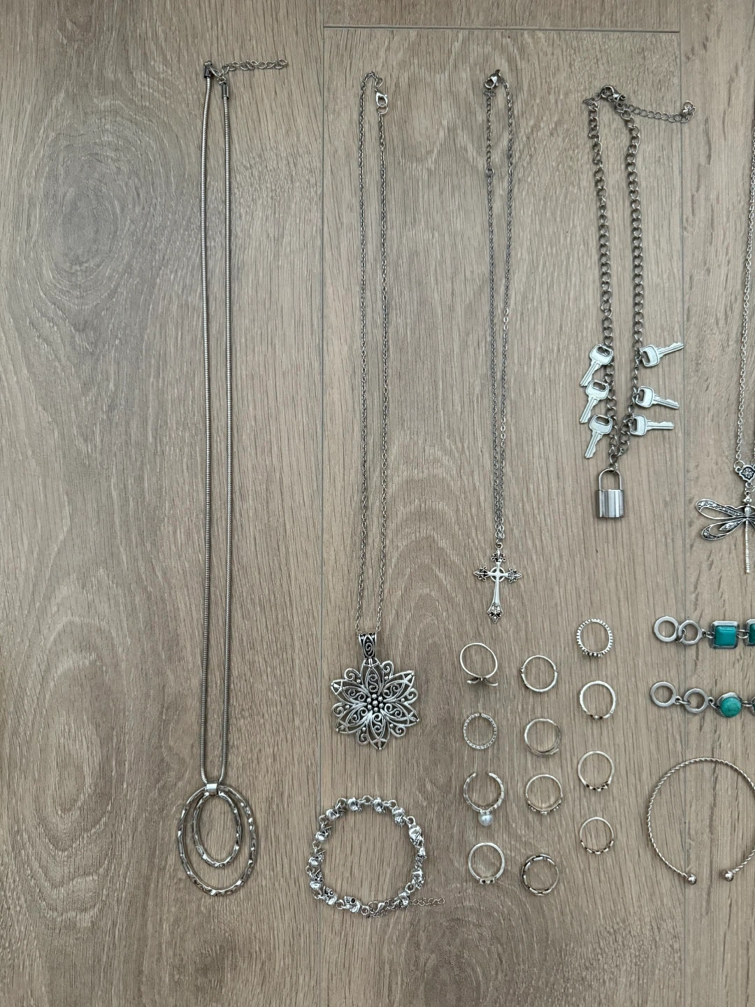 A collection of silver-tone necklaces, bracelets, rings, and charms. Includes pieces with floral, cross, dragonfly, and geometric designs. Great for accessorizing any outfit! Im selling all since Im a student and this is the price for all. Send me messages for individual prices!!