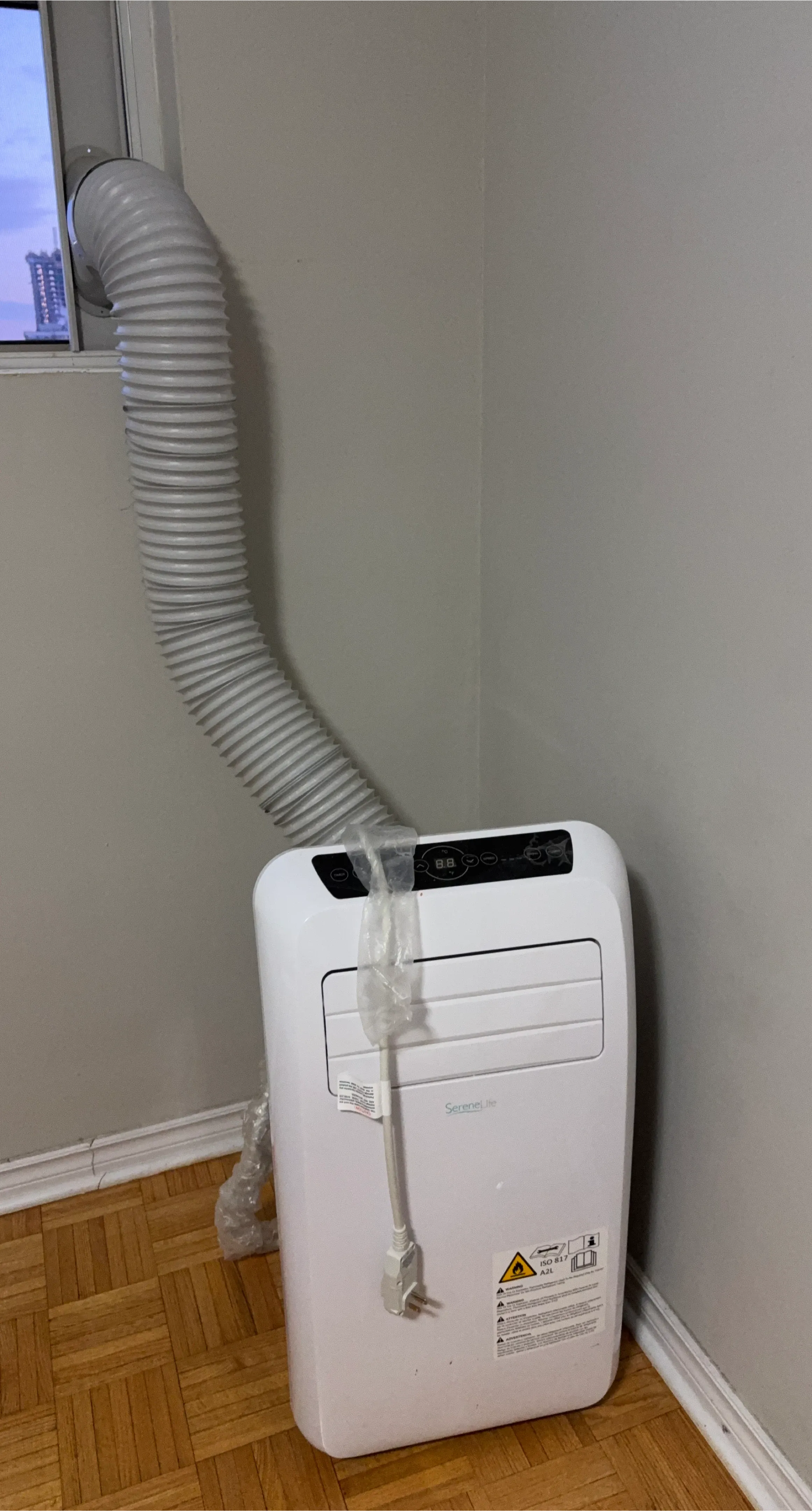 This is a white SereneLife portable air conditioner. It comes with an exhaust hose for venting. This unit is great for cooling personal spaces.
