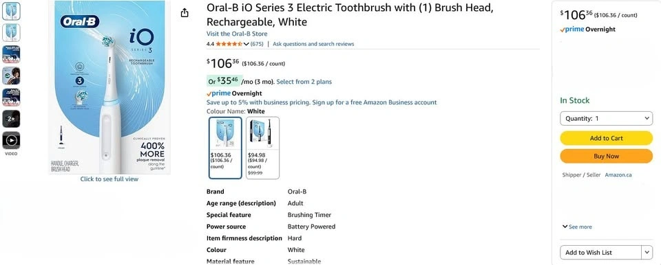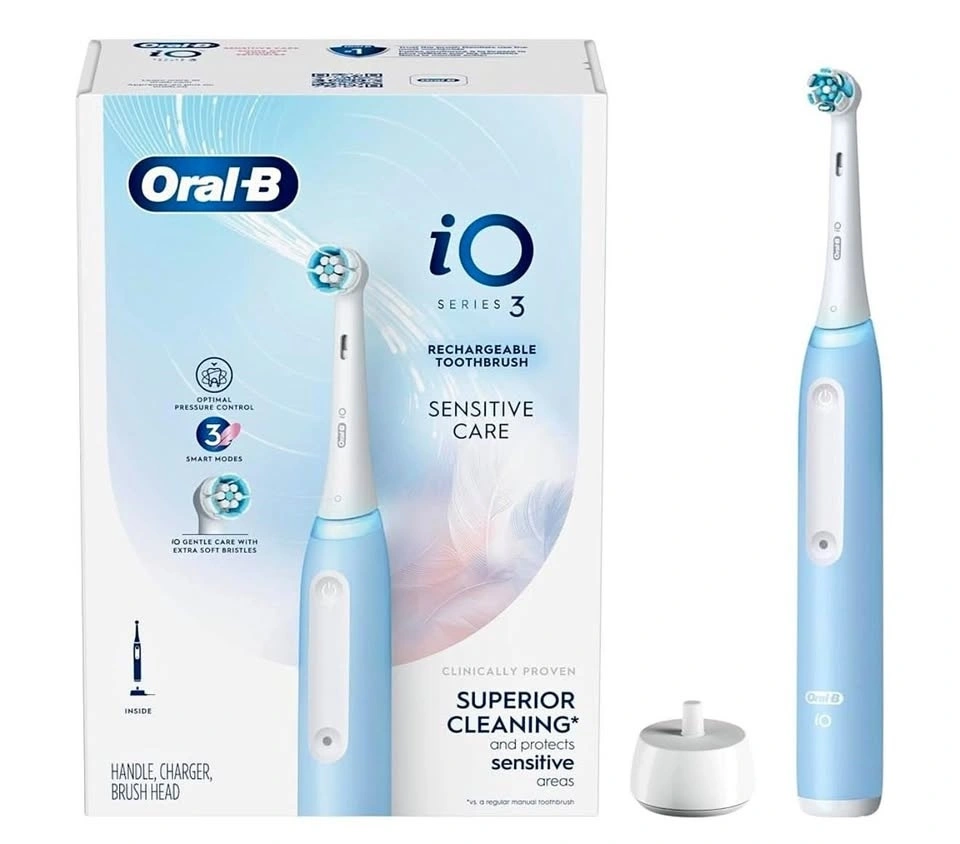 NEW in opened package. You will receive (1) Oral-B iO3 Electric Toothbrush, (1) Ultimate Clean Replacement Brush Head, and (1) charger. Clinically proven to remove 400% more plaque along the gumline vs. a regular manual toothbrush. Features 3 Smart Modes for personalized brushing: Daily Clean, Whiten, Sensitive. Includes a 2 minute timer for a complete clean. Pressure sensor indicates optimal cleaning pressure and warns of over pressure.