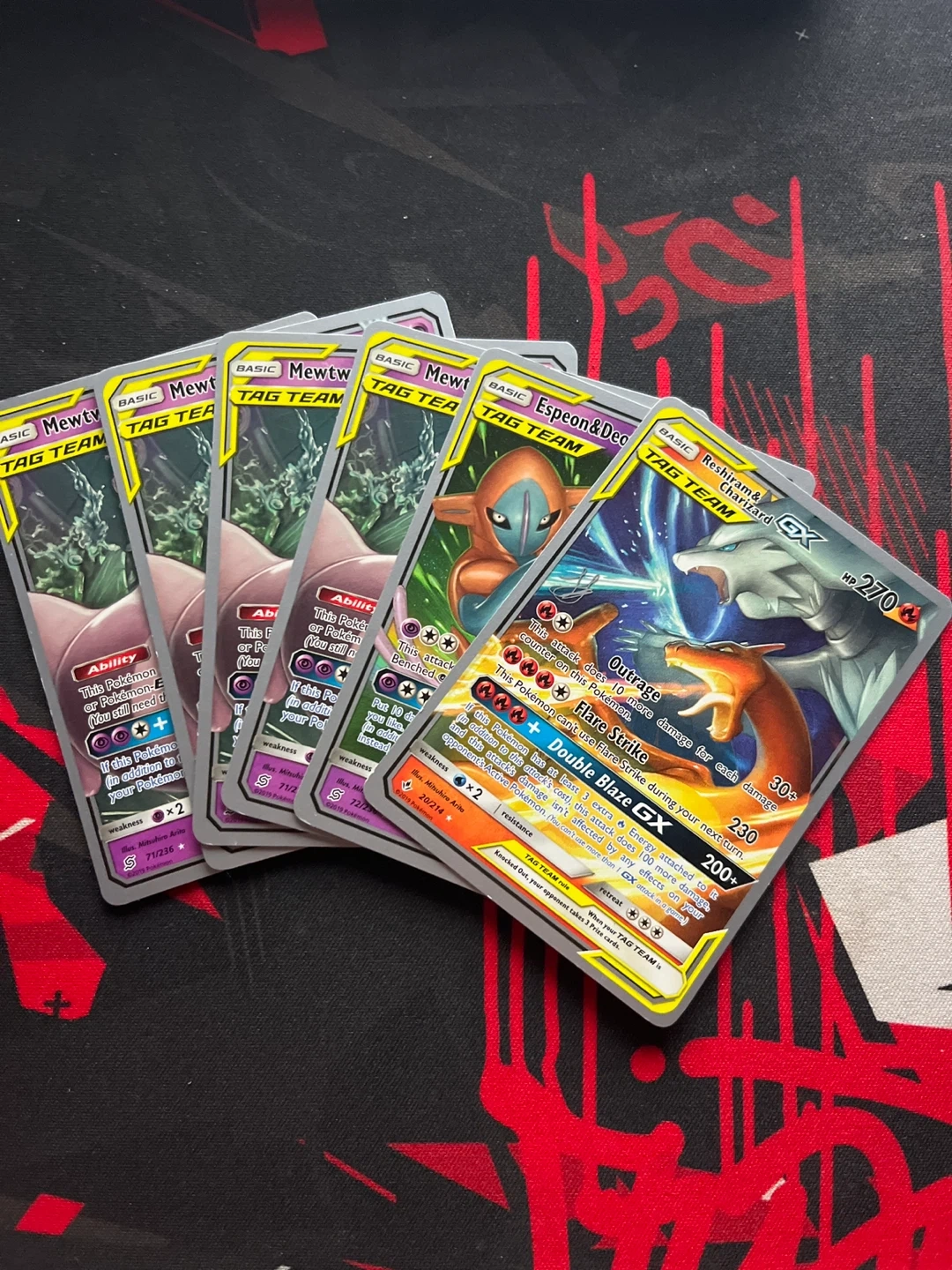 This listing includes a Reshiram & Charizard GX, Espeon & Deoxys GX, and two Mewtwo & Mew GX cards. They are all from the TAG TEAM GX series.