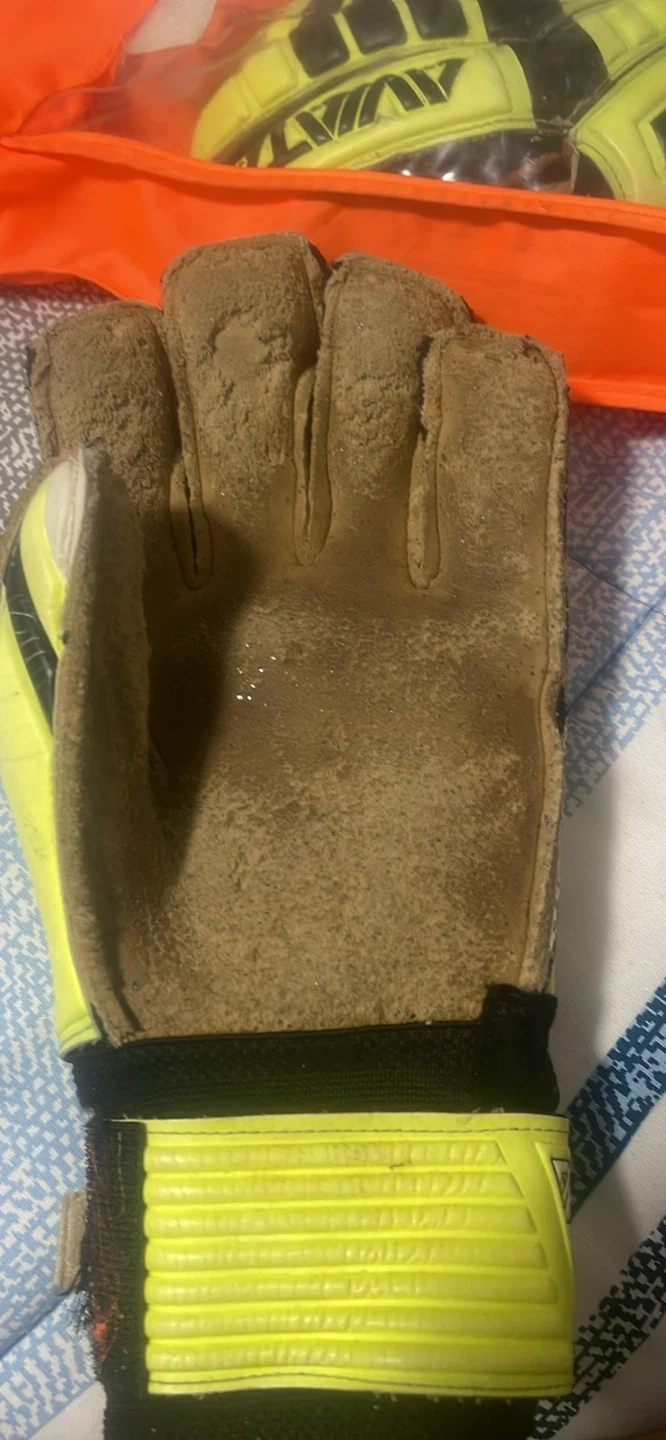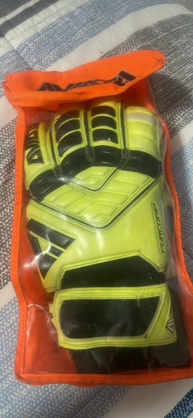 Yellow and black AVIA PureGrip goalie gloves with a clear orange carrying bag. These gloves are designed for grip and protection on the field. They appear to be well-used, as shown in the second image.