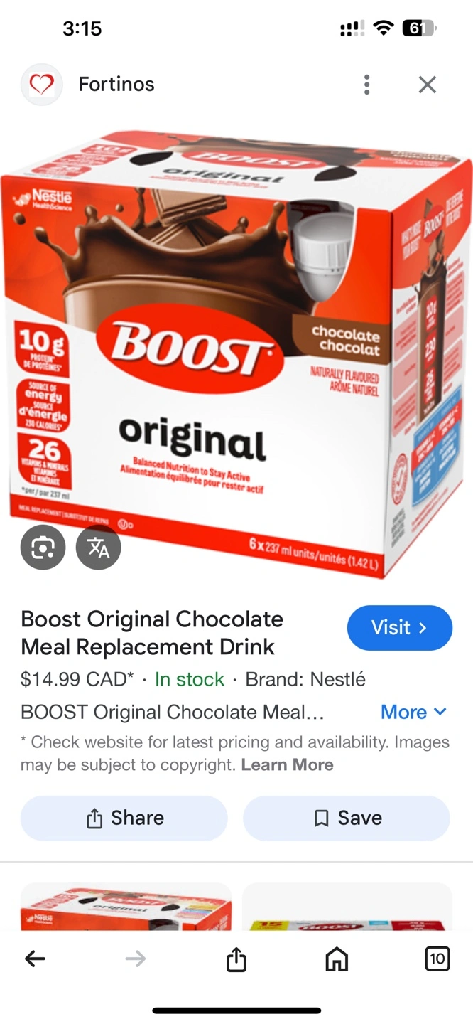 4x6 237ml bottles of Nestlé Boost Original Chocolate meal replacement drink. Naturally chocolate flavoured. Balanced nutrition to stay active. Expiry date: February 11, 2026.