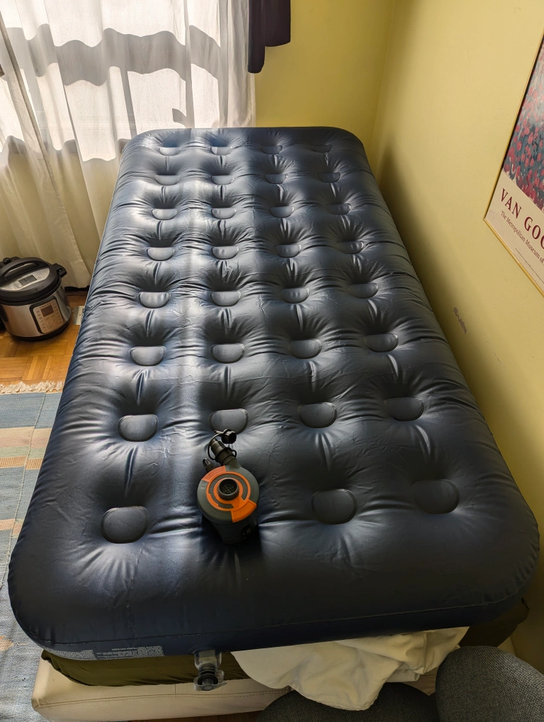Twin size inflatable air mattress with built-in pump. Includes a patch kit. Used once.