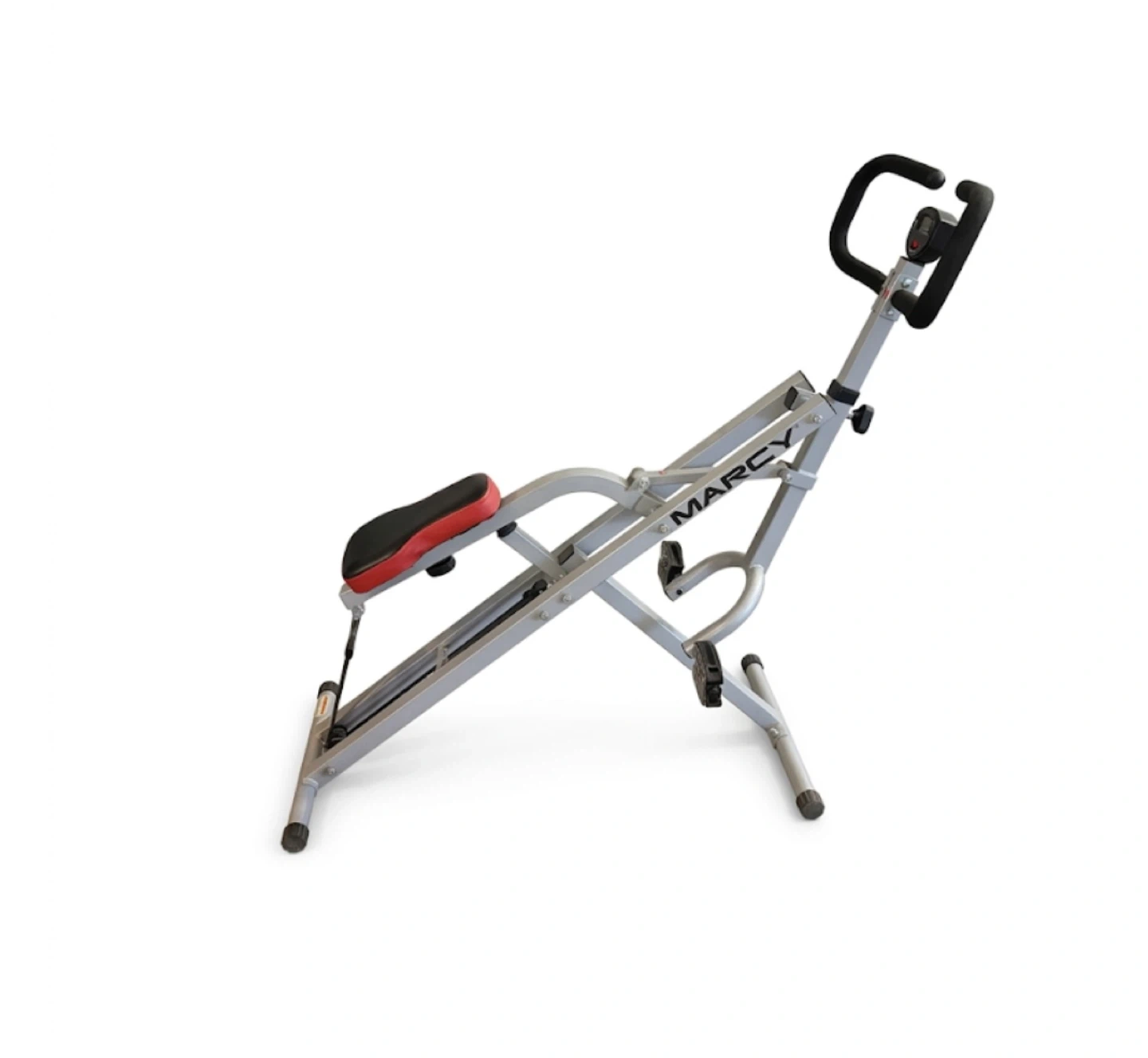 This Marcy home gym squat row machine offers a versatile workout. It's constructed with a durable steel frame and features an adjustable seat with a red and black padded cushion. The machine includes foot pedals and handlebars for a full-body exercise.