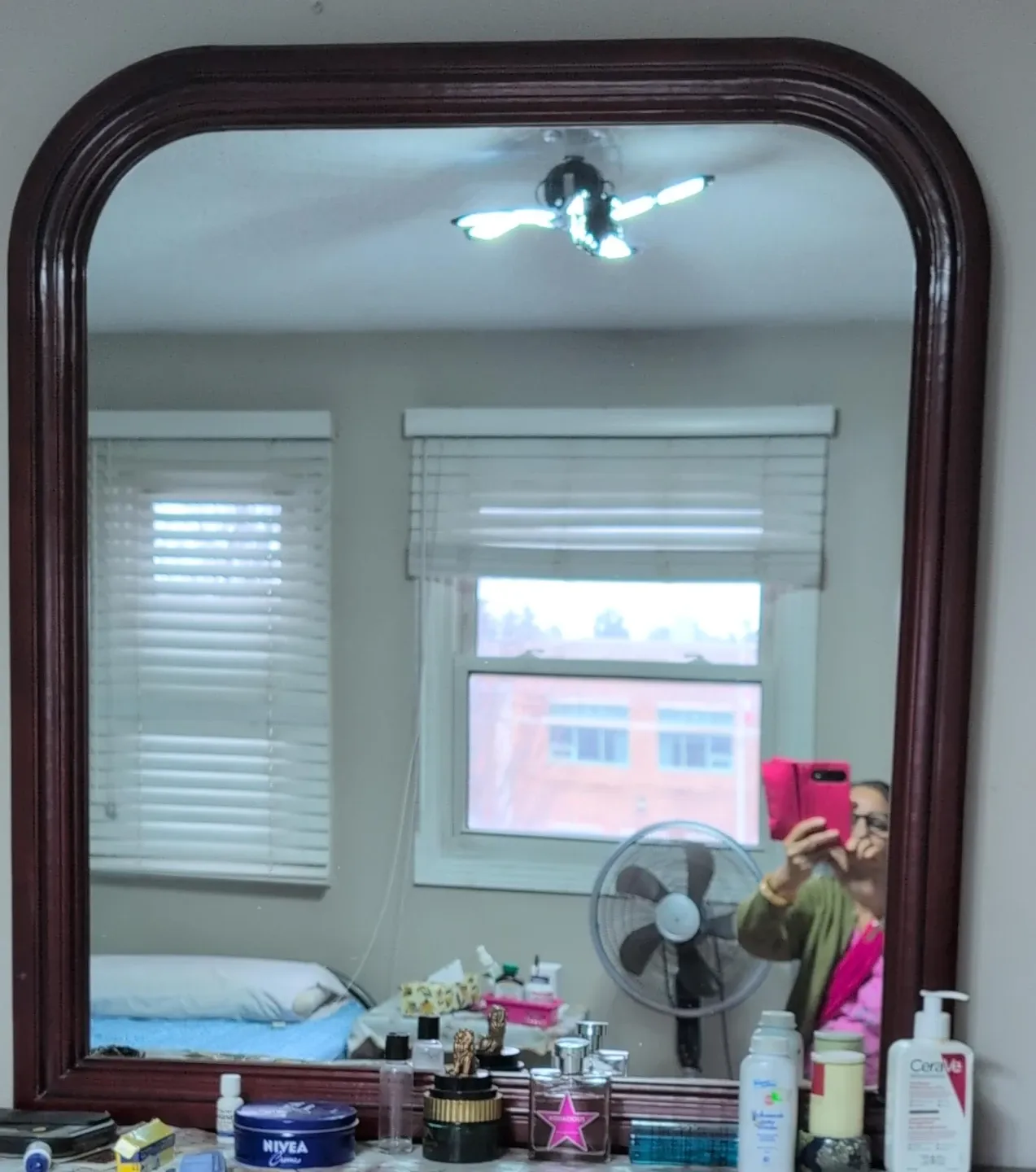 This is a beautiful arched mirror with a dark wood frame. It's perfect for a dresser or entryway. The frame has a classic, elegant design.