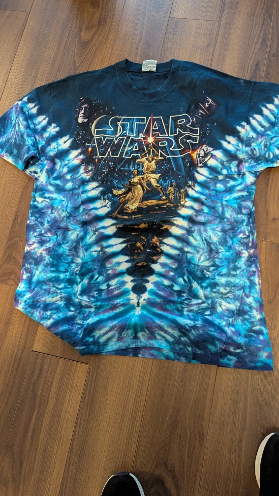 Rare vintage Star Wars tie-dye t-shirt. Features iconic imagery from the film series. All-over print. Unique piece for any collector.