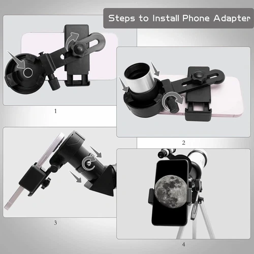 Portable 500mm refracting telescope with an adjustable tripod, a bag, a phone adapter, and a wireless remote. Great for astronomy enthusiasts and beginners.