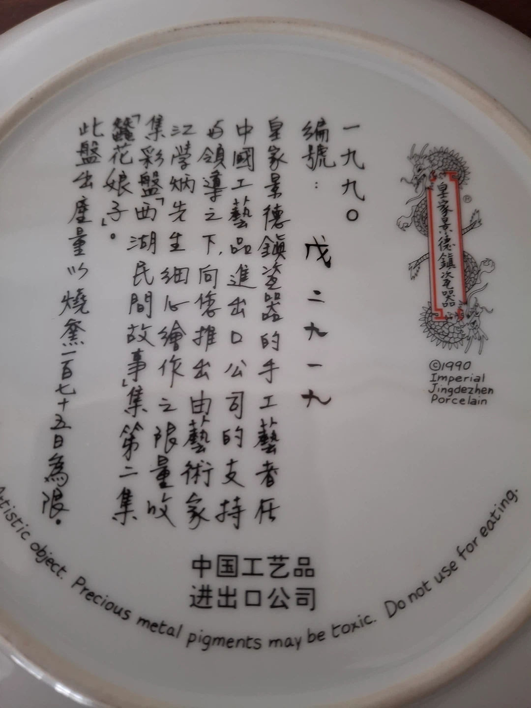 Decorative plate, 1990 Imperial Jingdezhen porcelain. Beautiful detailed design. Plate only (no stand or hanger). Excellent condition.
