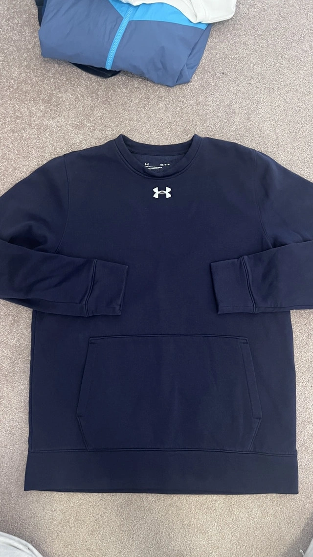 This is a navy blue Under Armour crewneck sweatshirt, perfect for workouts or casual wear. It features a comfortable fit and the Under Armour logo on the chest. It is in used but good condition. Brand: Under Armour. Colour: Navy Blue. Size: Medium.