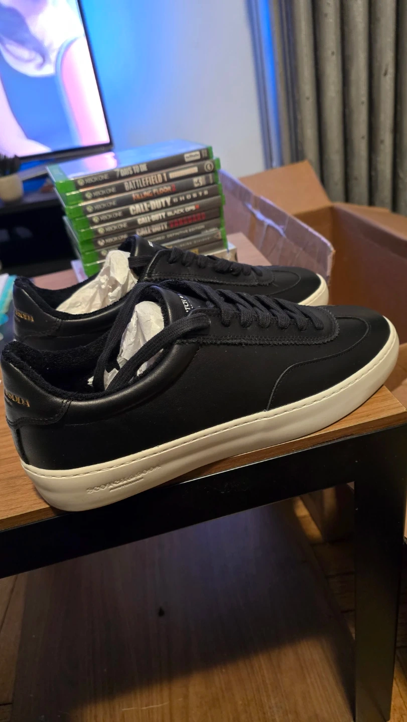 These are black leather sneakers from Scotch & Soda. They feature a classic low-top design with a white rubber sole. The size is 42.