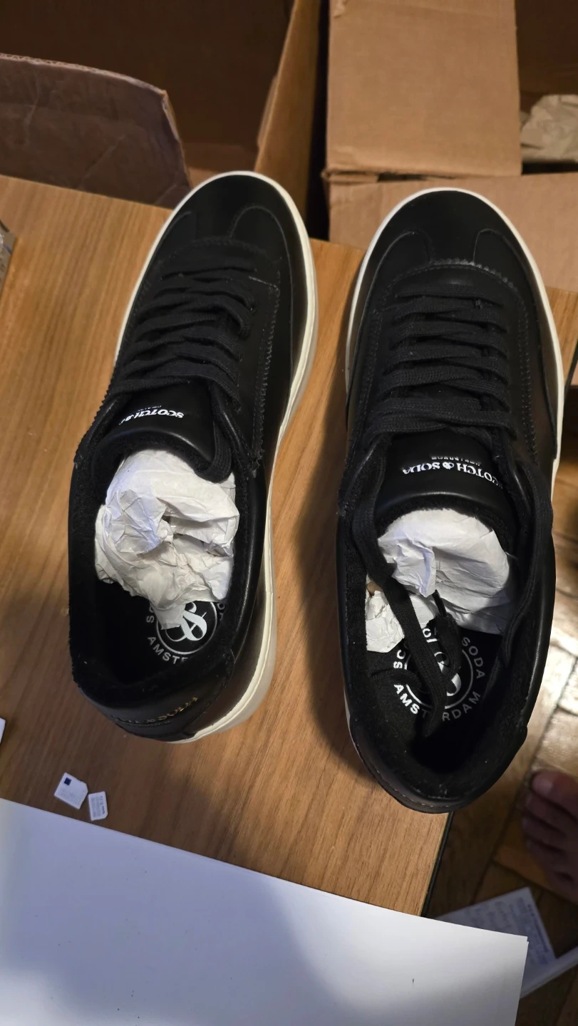 These are black leather sneakers from Scotch & Soda. They feature a classic low-top design with a white rubber sole. The size is 42.