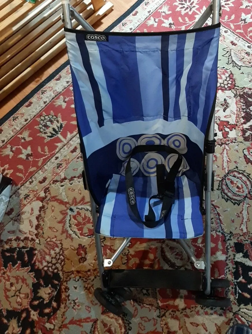 This is a blue and white striped Cosco lightweight umbrella stroller. It features a secure harness for your little one. It's designed for easy portability and quick setup.