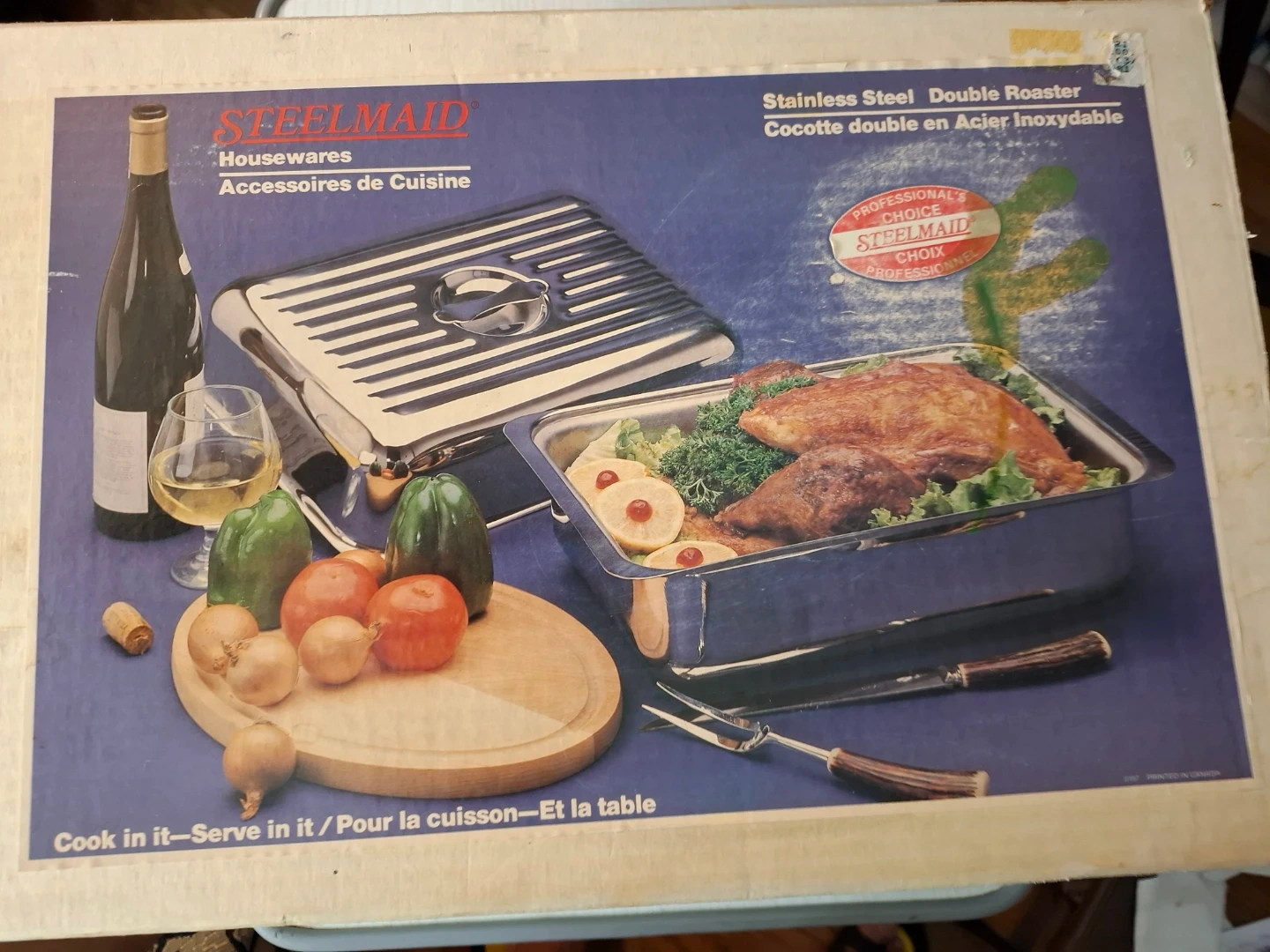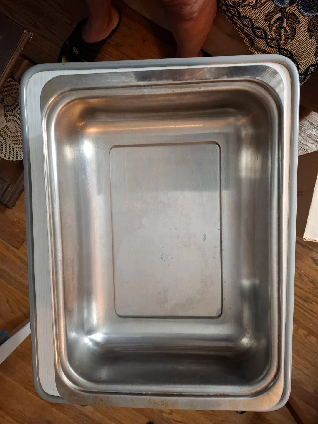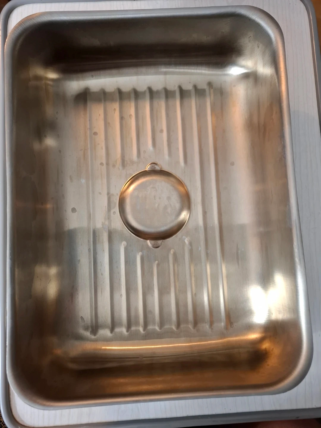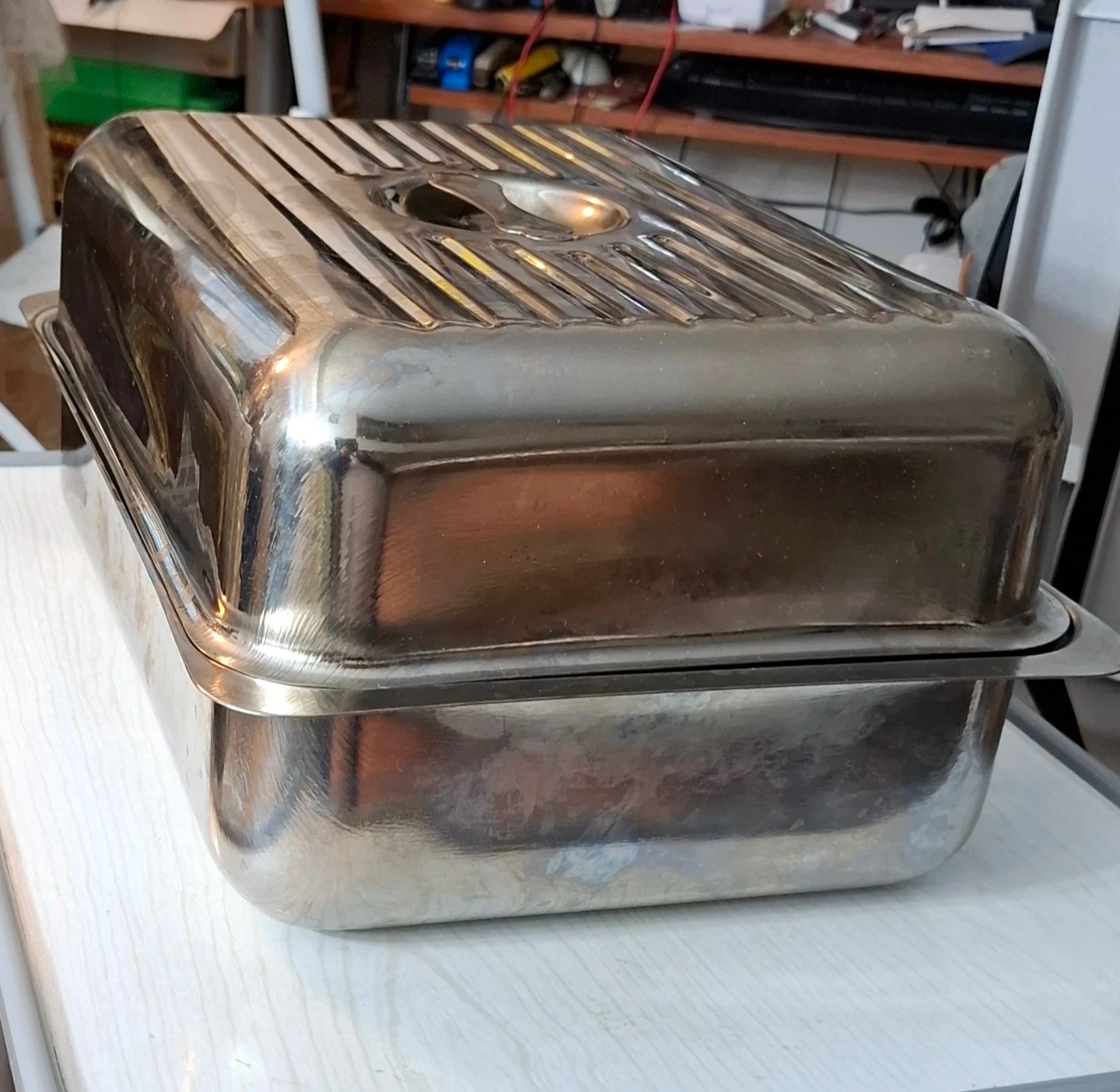 This is a rectangular Stainless steel roasting pan with a lid. It's made of stainless steel and has a ribbed interior. The pan measures approximately 14 inches long by 11 inches wide and 8 inches deep. It's suitable for roasting or serving.