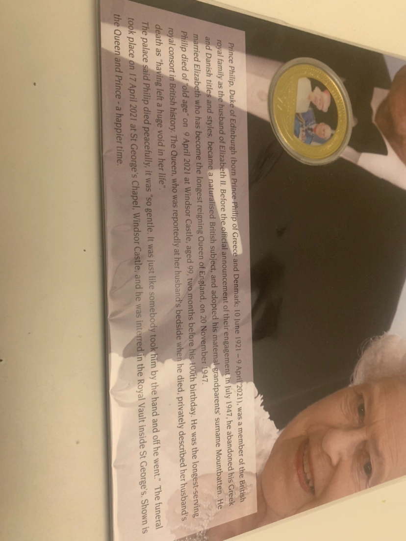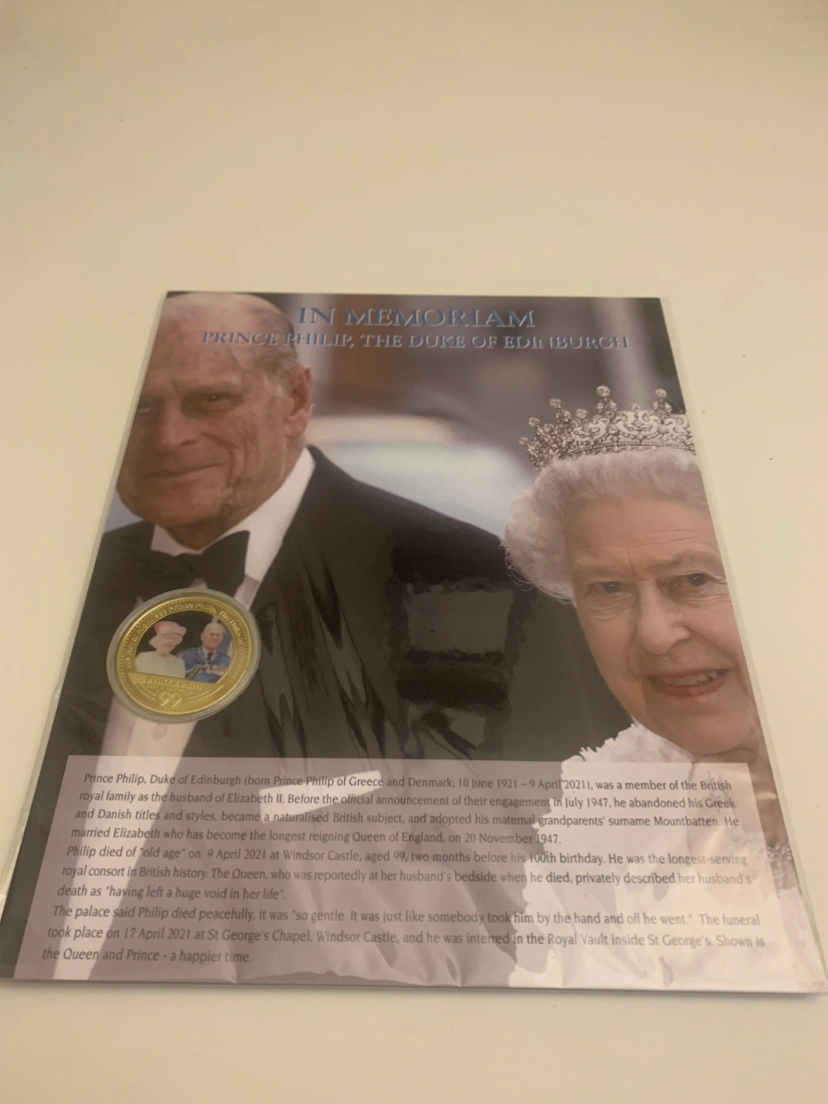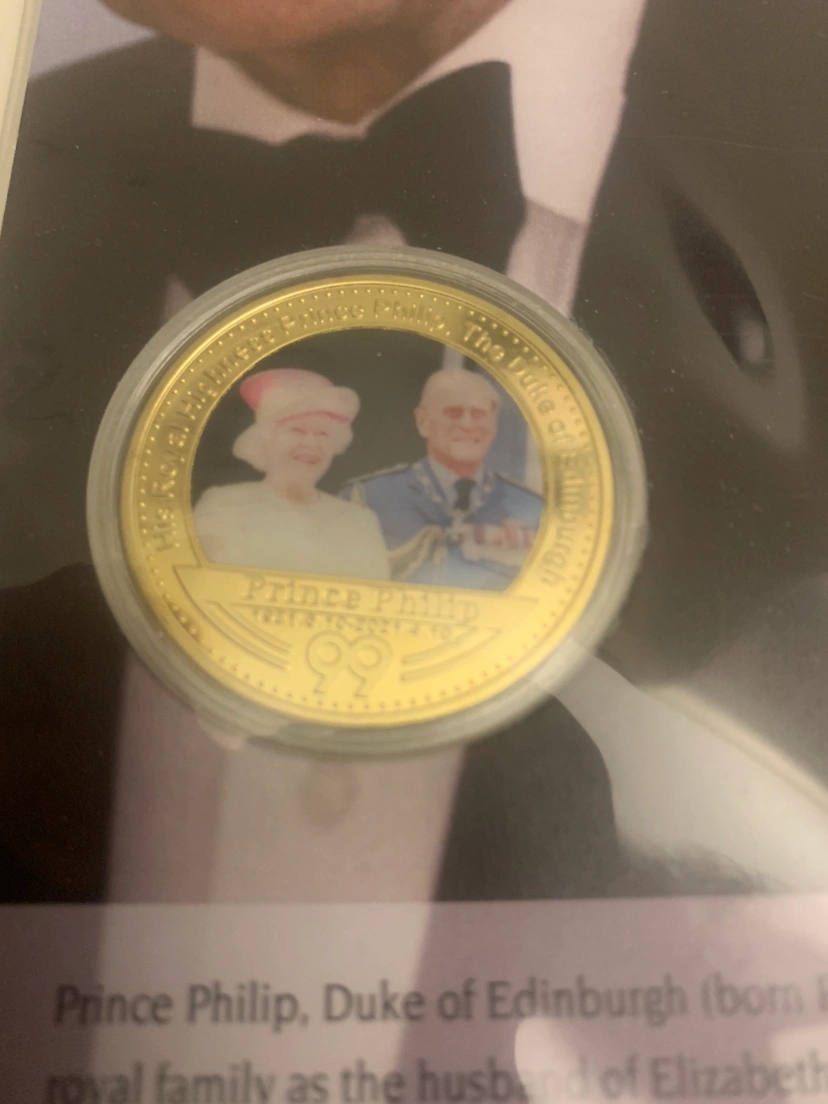 A 24kt GP coin commemorating Prince Phillip with the image of Prince Philip and Queen Elizabeth with a beautifully well done art glicee.