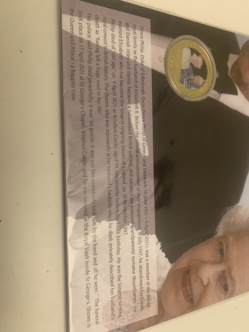 A 24kt GP coin commemorating Prince Phillip with the image of Prince Philip and Queen Elizabeth with a beautifully well done art glicee.