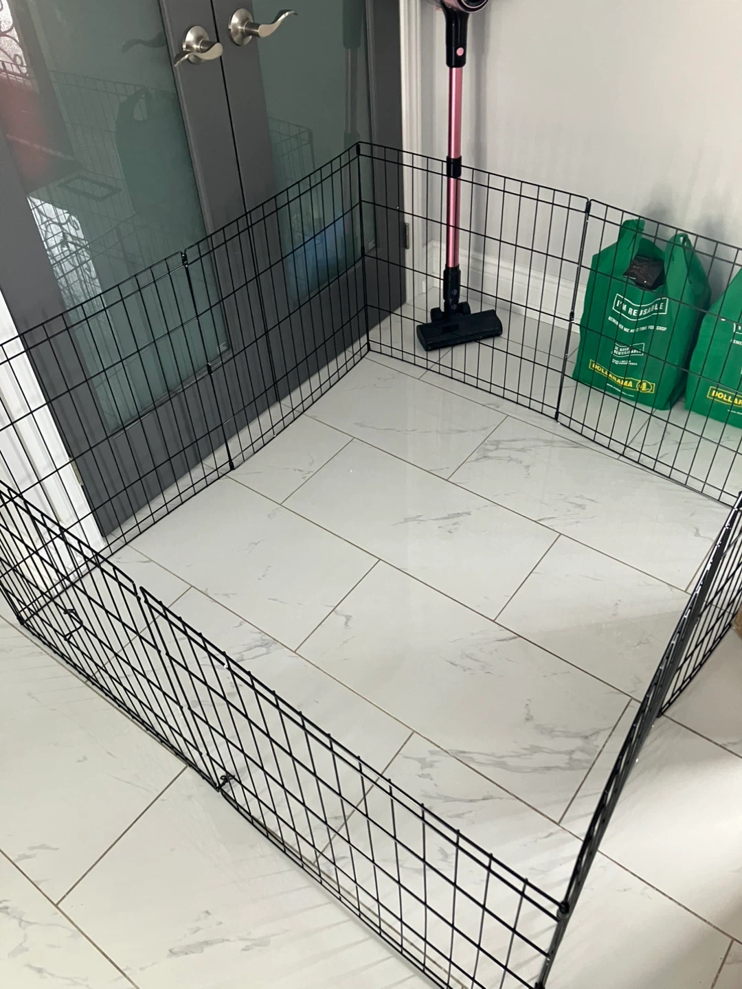 This is a black metal playpen for pets. It's made of durable wire panels and is easy to set up. This pen provides a safe space for small animals.24x24 inch each panel