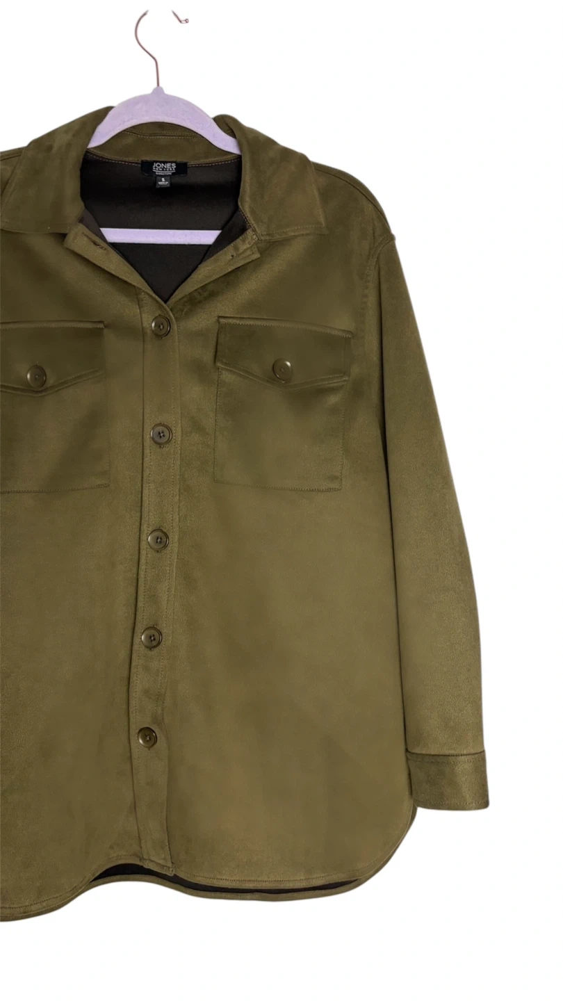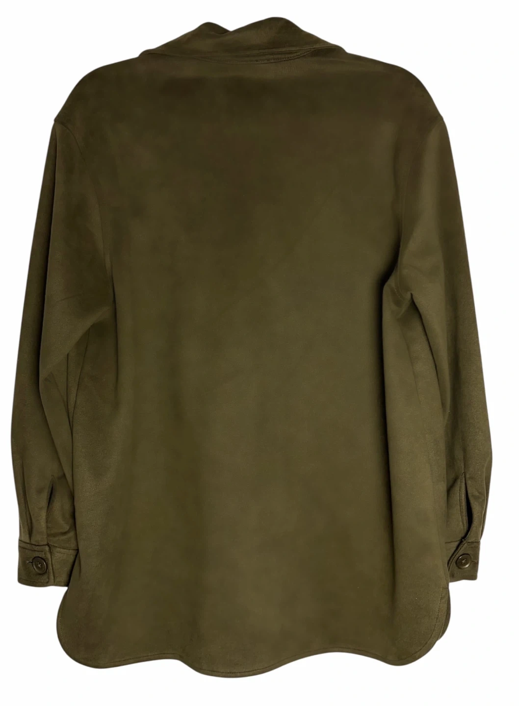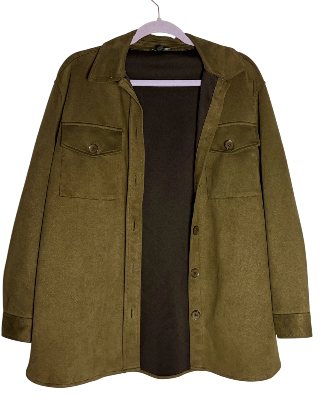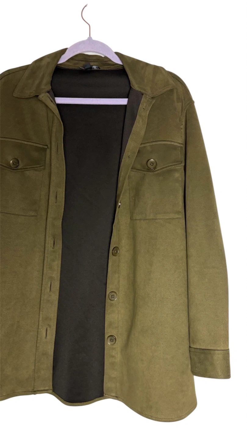 Stylish olive green button-up shirt with front pockets. Perfect for casual wear.