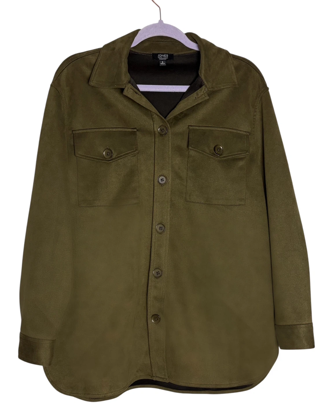 Stylish olive green button-up shirt with front pockets. Perfect for casual wear.