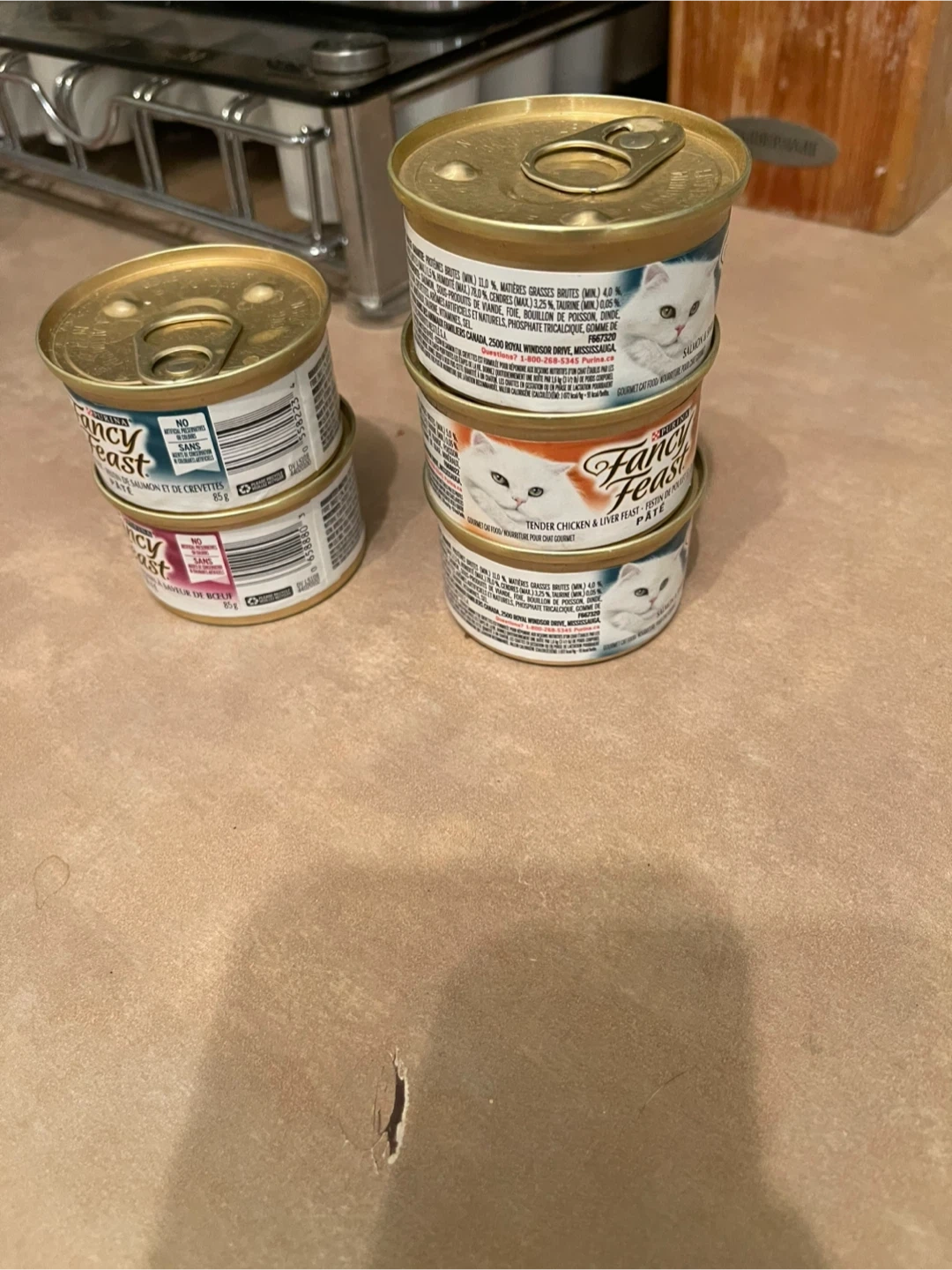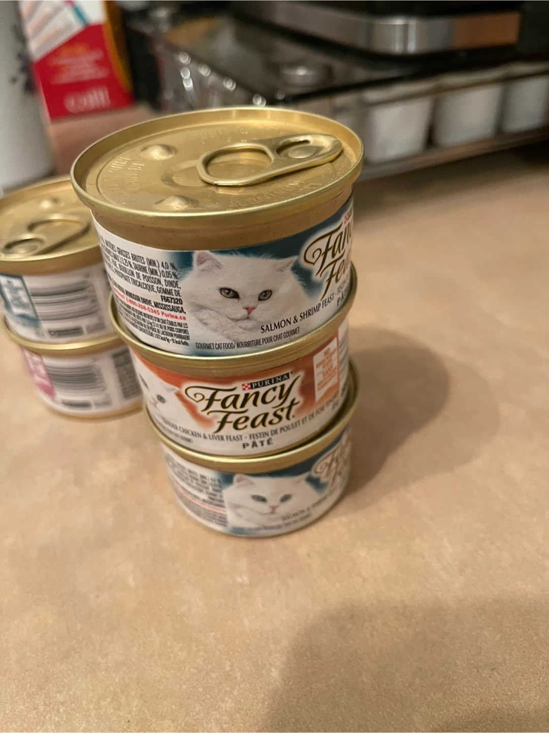 Selling a few cans of Fancy Feast cat food! There are assorted flavours like salmon & shrimp and tender chicken & liver feast. Best before October 2025
