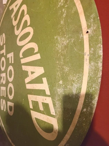 Vintage Associated Food Stores round sign, located in Vancouver BC Canada. Year unknown, but likely early century. Nice patina on front, and a bit of cleanup will make it look nice. Unsure if the front is porcelain or not. Very heavy and appears to be sheet metal or tin. Pretty rigid, likely 1/16-3/8" thick and roughly 3 feet in diameter, but unconfirmed. Feel free to message if you have any questions!