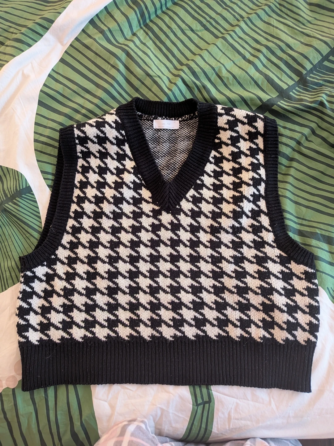 This OAK + FORT knit vest features a classic houndstooth pattern. This vest is a size Small. Oversized boxy fit. Unisex style