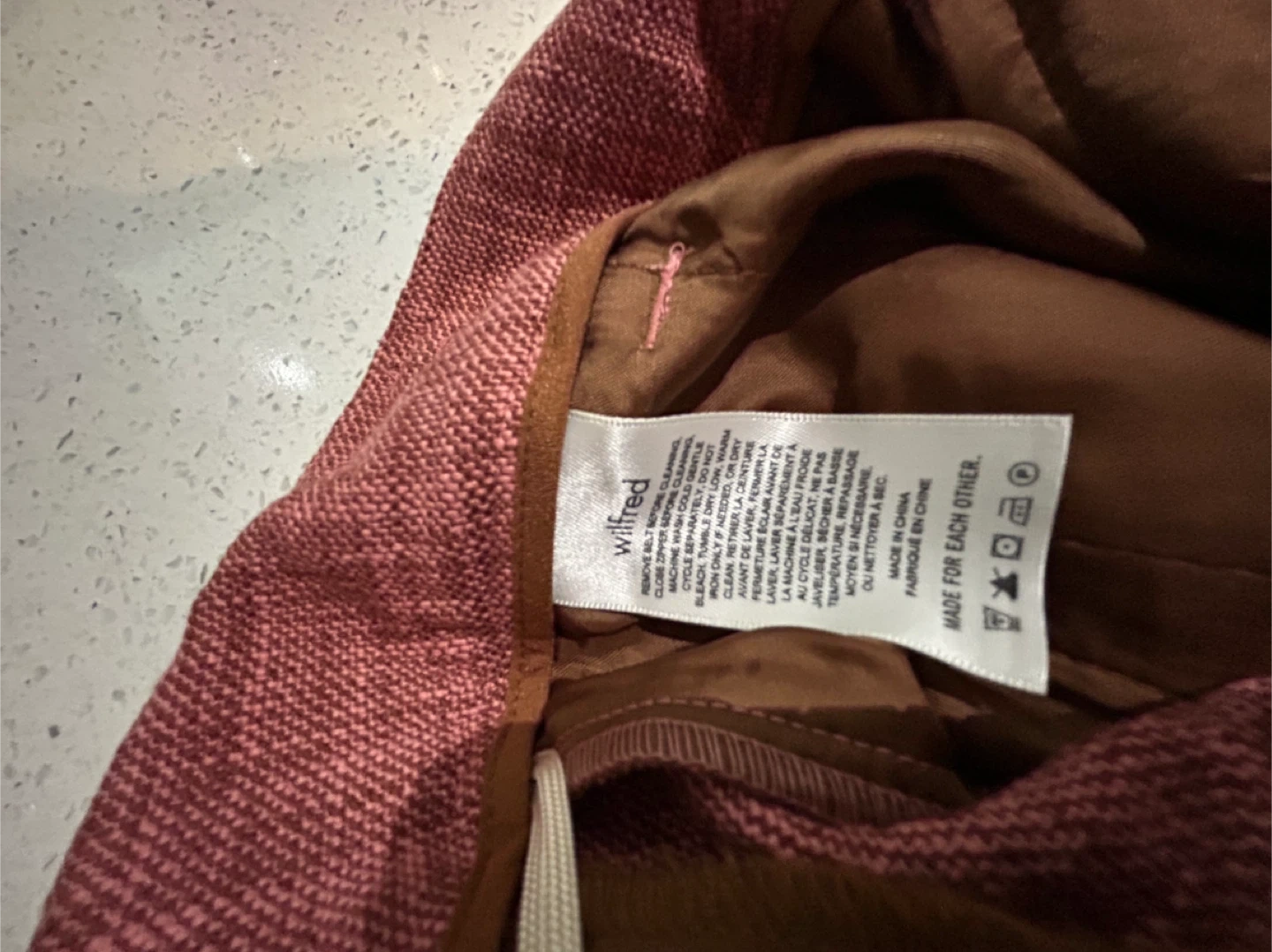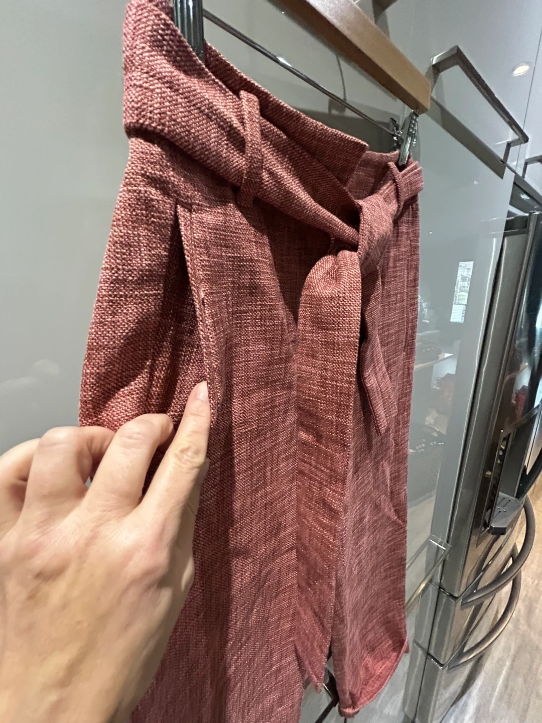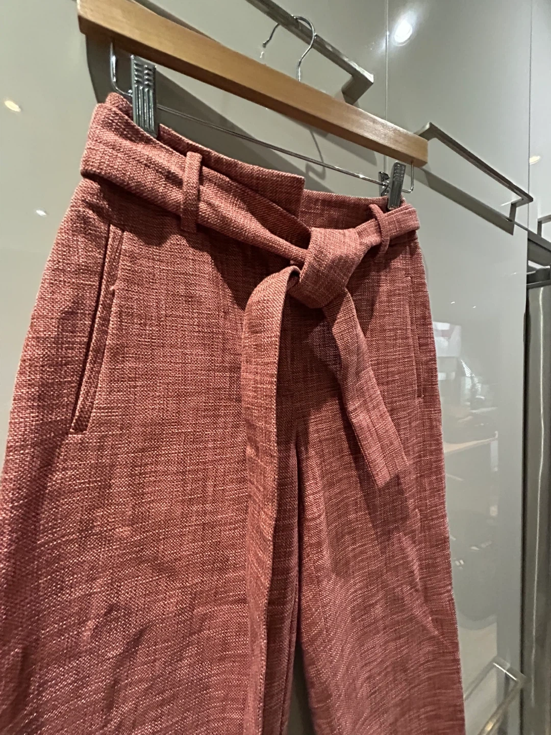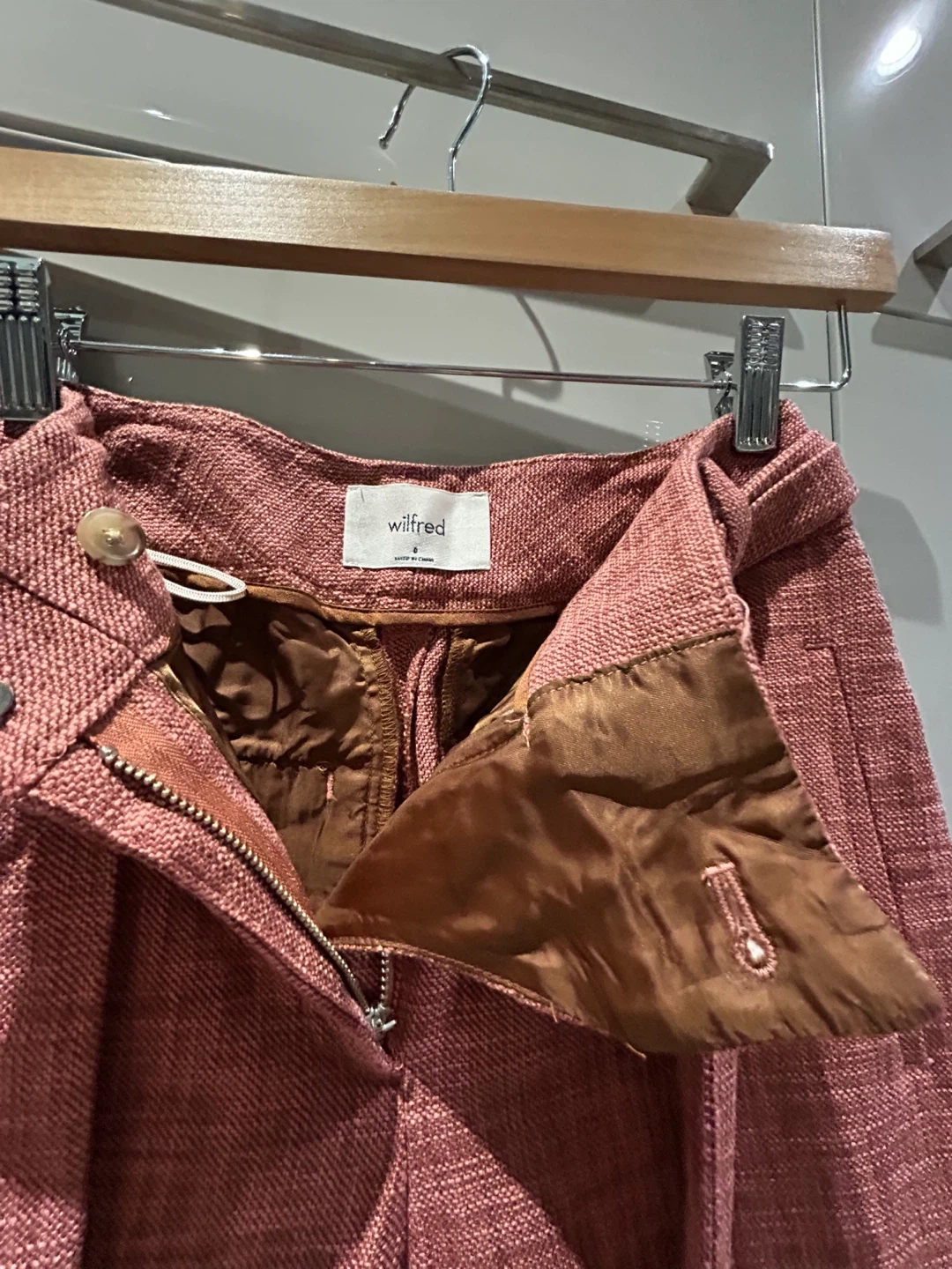 These Wilfred pants are a nice rose colour and feature a tie waist. They're made from a cotton blend fabric.