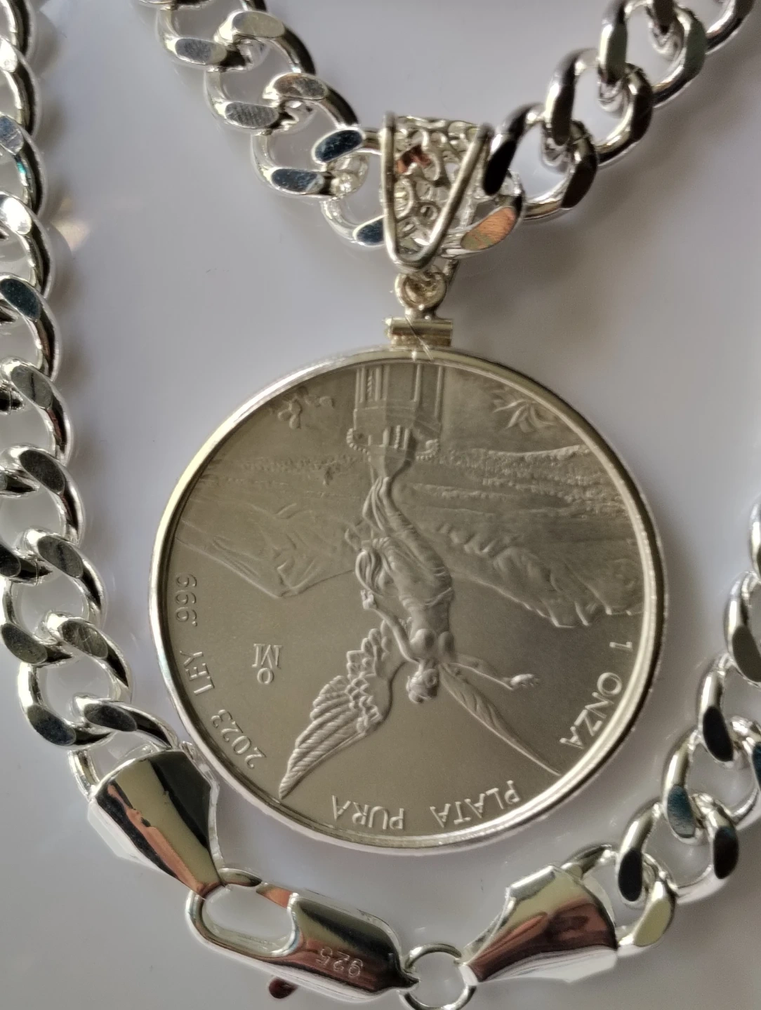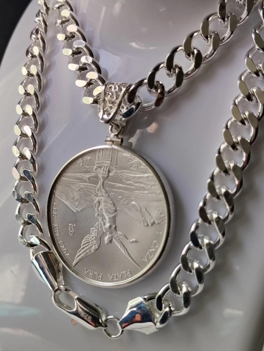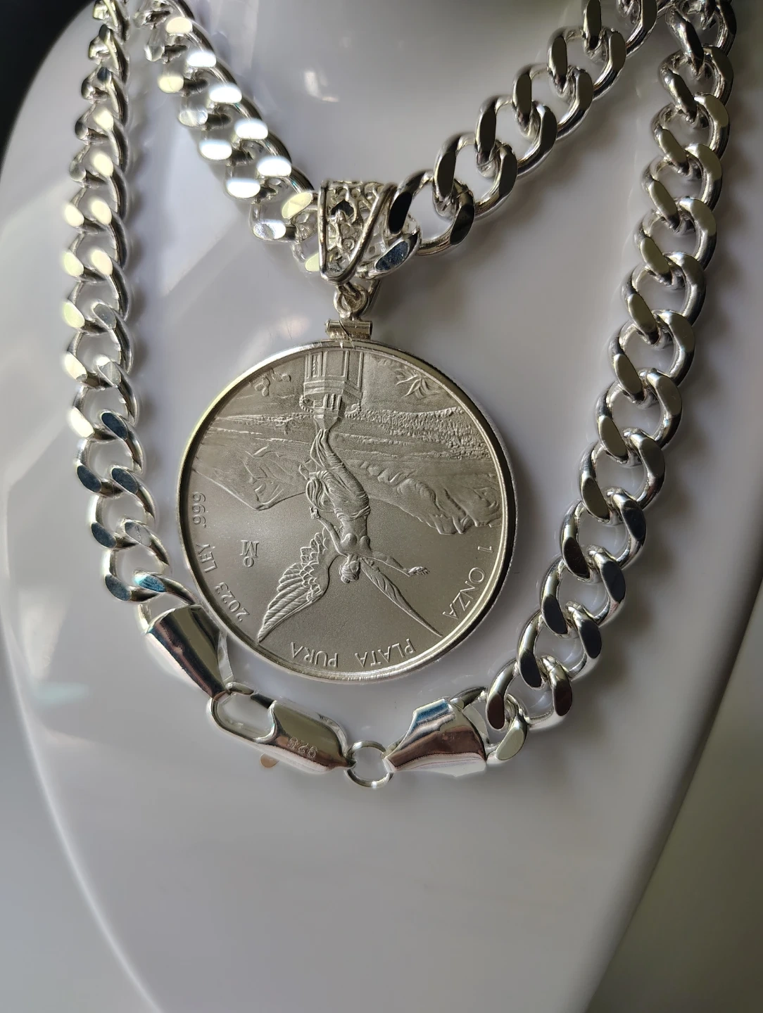 Collar chapado de plata de 24 pulgadas de largo y 10mm. De ancho. Con moneda de plata 2023 Libertad de México 1oz plata fina.999. con el soporte de moneda silver sterling.