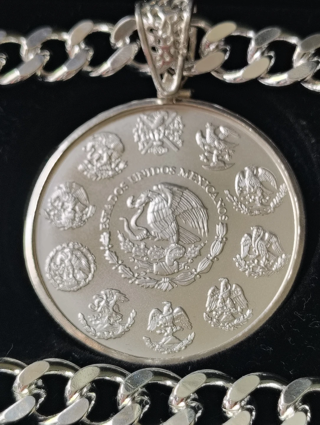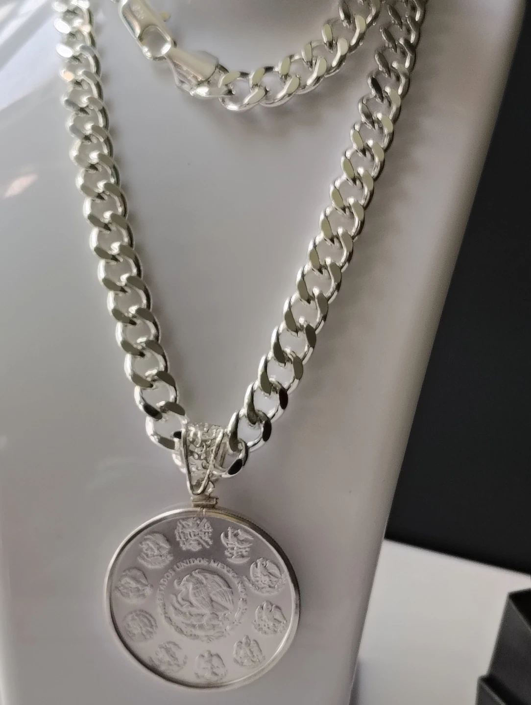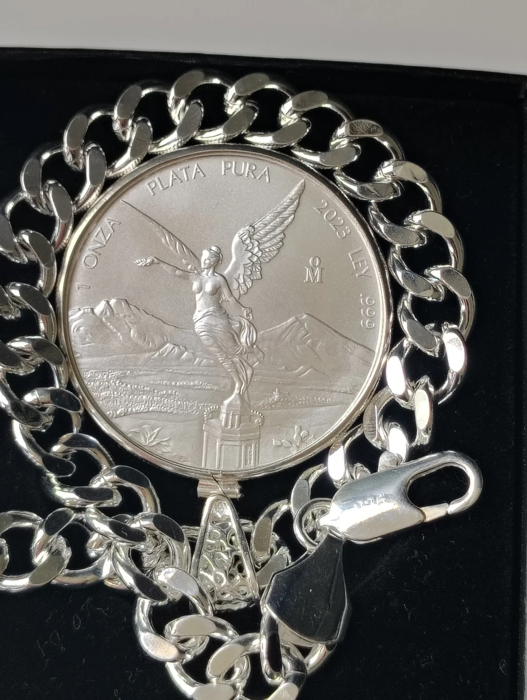 Collar chapado de plata de 24 pulgadas de largo y 10mm. De ancho. Con moneda de plata 2023 Libertad de México 1oz plata fina.999. con el soporte de moneda silver sterling.