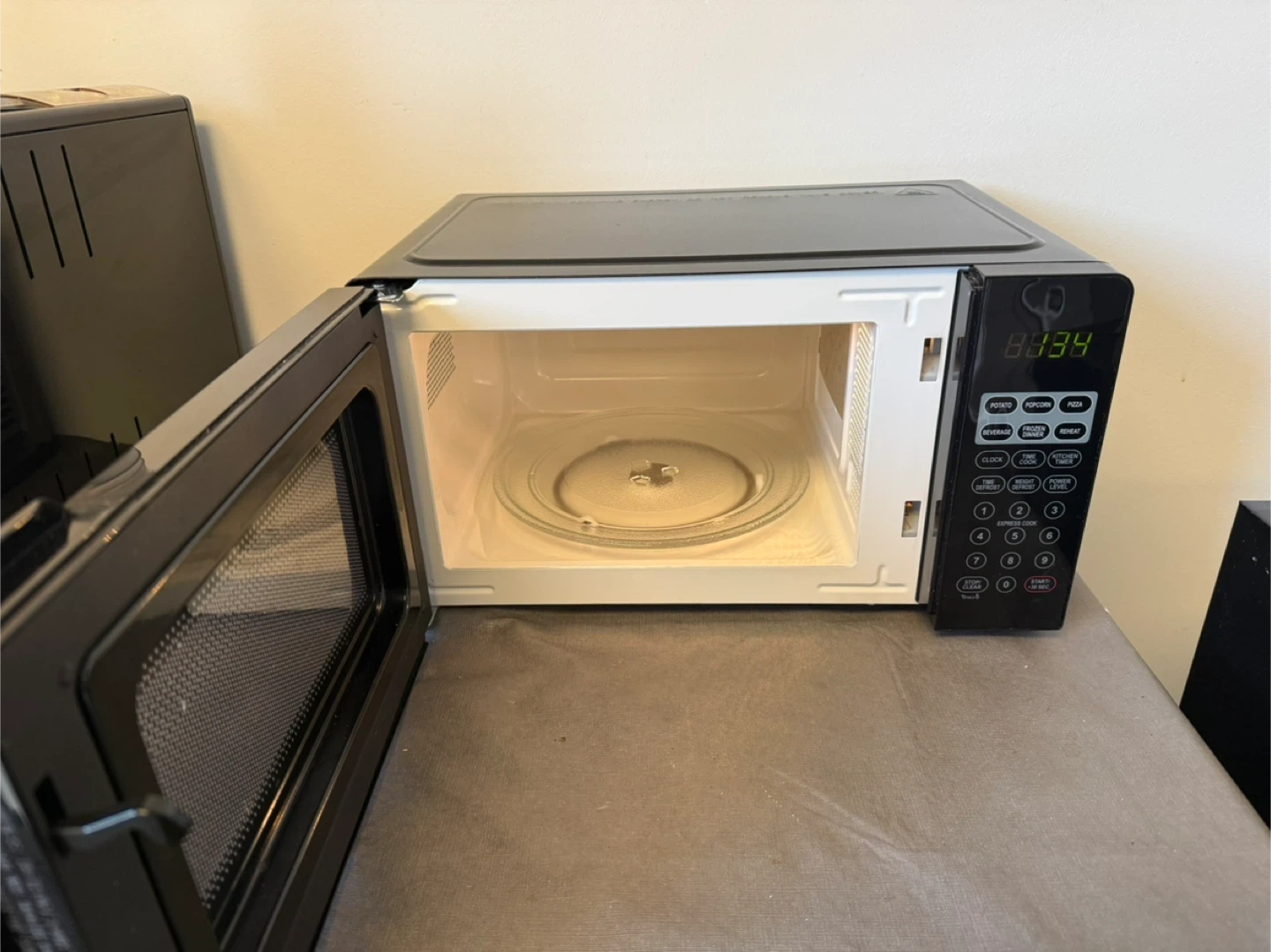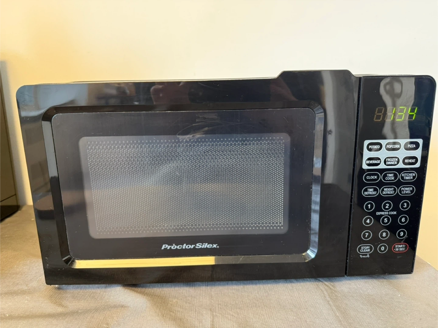 Rarely used. Proctor Silex microwave. It has a digital display and preset cooking buttons for common items. The interior is white and features a glass turntable.