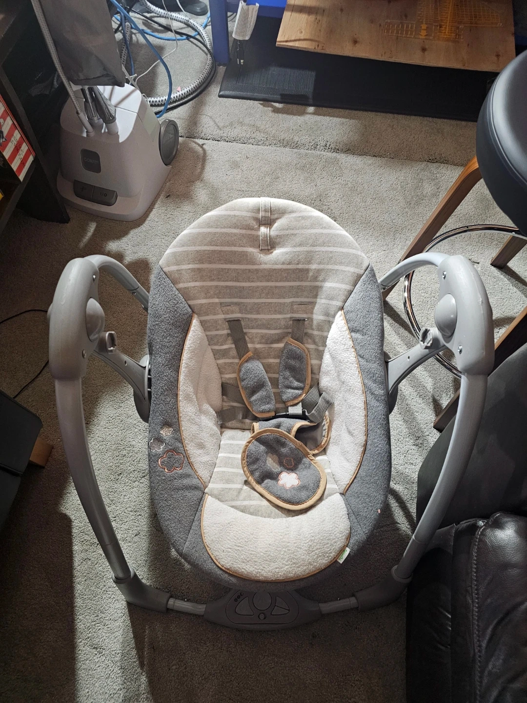 This baby swing is grey with white stripes. It has a soft cushioned seat and a 5-point harness for safety. The frame is sturdy and it's designed for comfort. It would be useful for soothing a fussy baby.