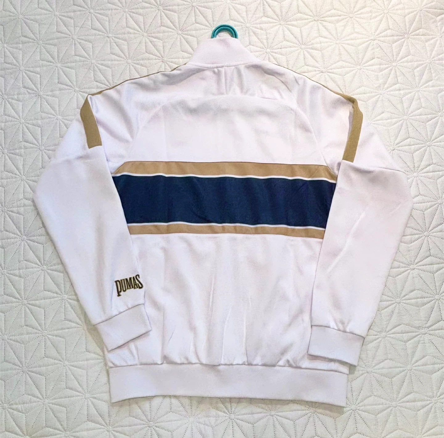 The jacket is white with a classic navy blue / gold band design on the front. The end of the sleeve comes with a classic PUMAS lettering - another hint at a traditional design.
