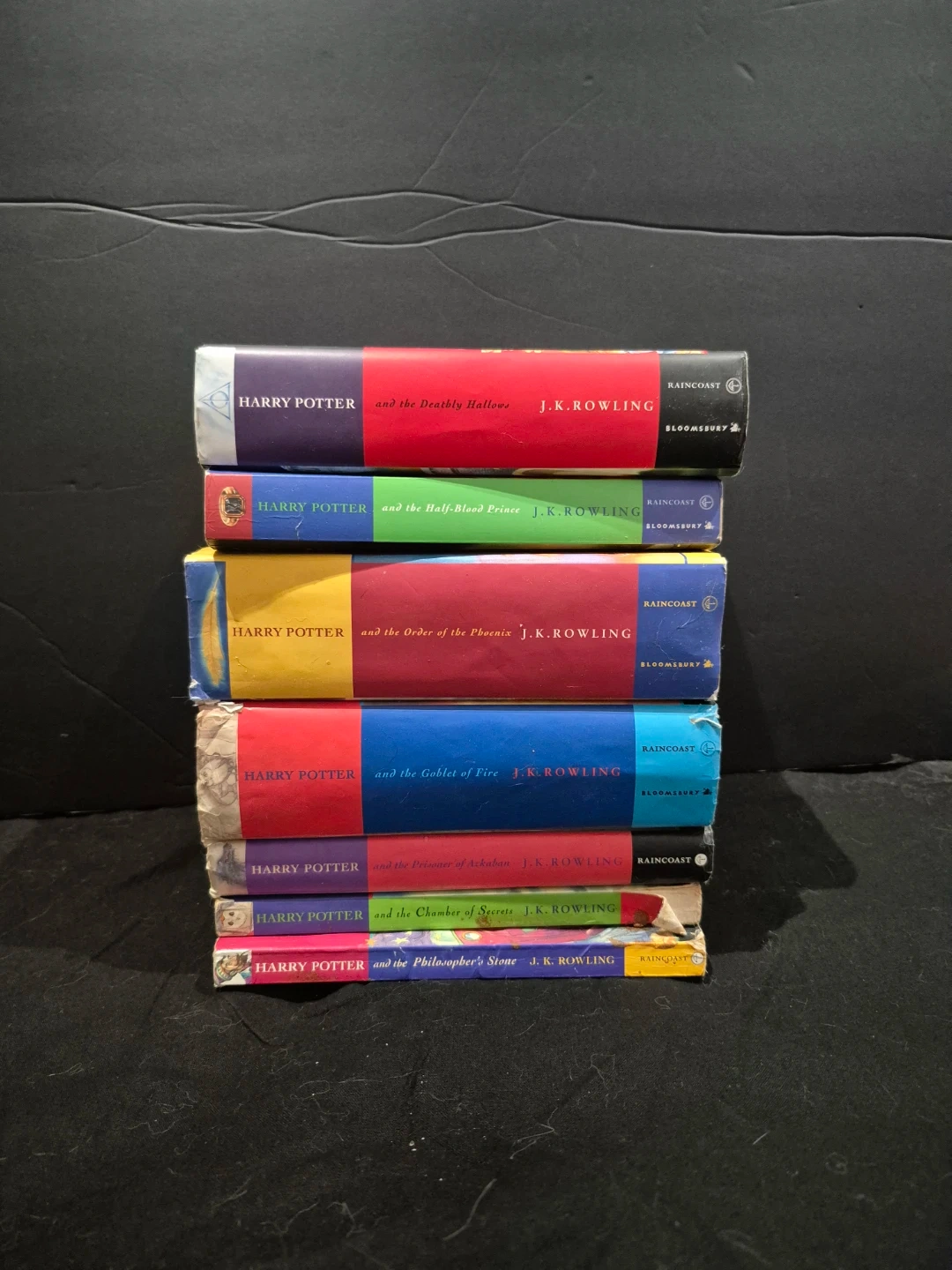 Original covers of the HP series books. Books 1-3 are paperback with a few bends and tears in the pages, books 4-7 are hard cover.